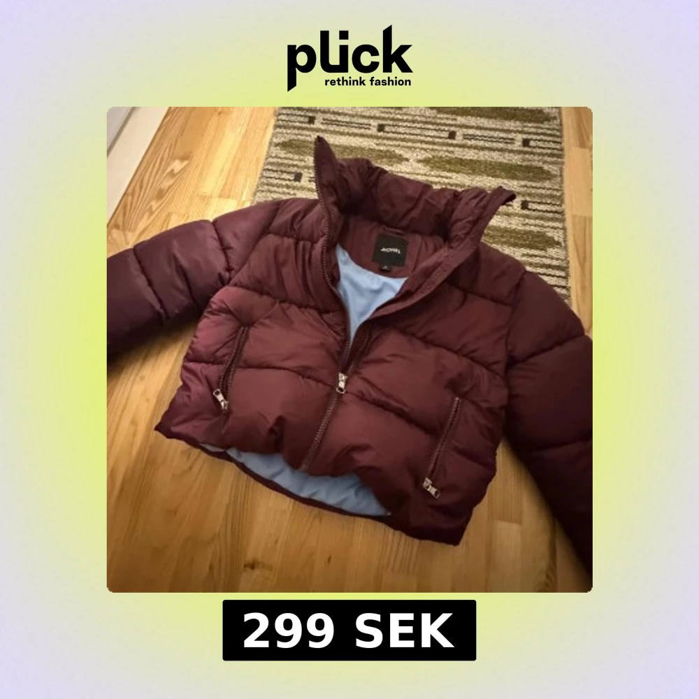 Vinröd Pufferjacka som är blå på insidan i storlek M från monki, endast provad. Nypris 800 kr. använd ”köp nu”