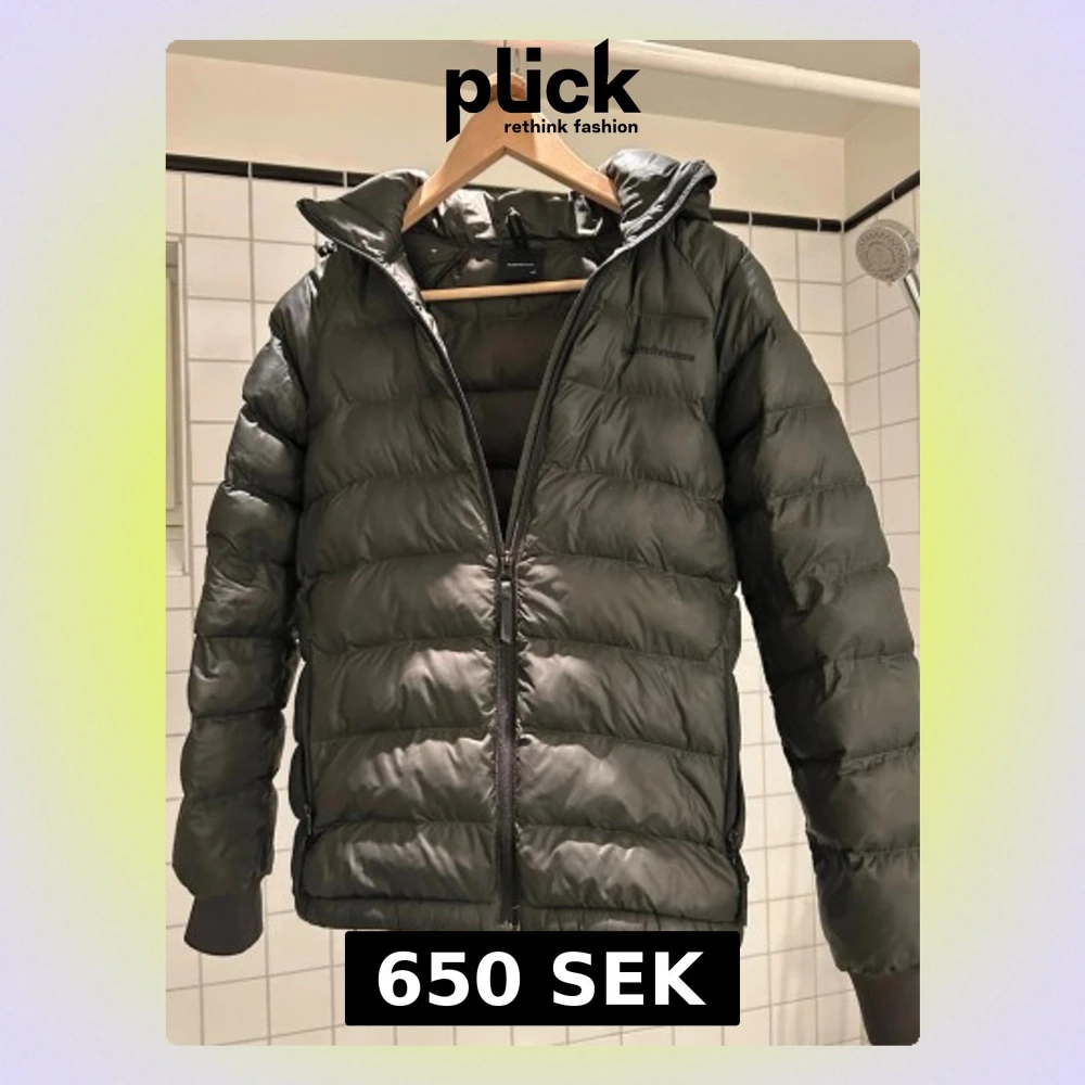 Säljer en mörkgrön pufferjacka från Peak Performance med huva och dragkedja framtill. Jackan har quiltad design och ribbade muddar vid ärmslut. Materialet är syntet och jackan är perfekt för kyliga dagar. Finns även en lagad detalj på ryggen.