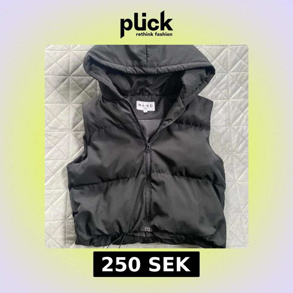 Svart dunväst från NA-KD med huva och dragkedja framtill. Västen har en quiltad look och dragsko nertill för justerbar passform. Kort modell. Som ny!