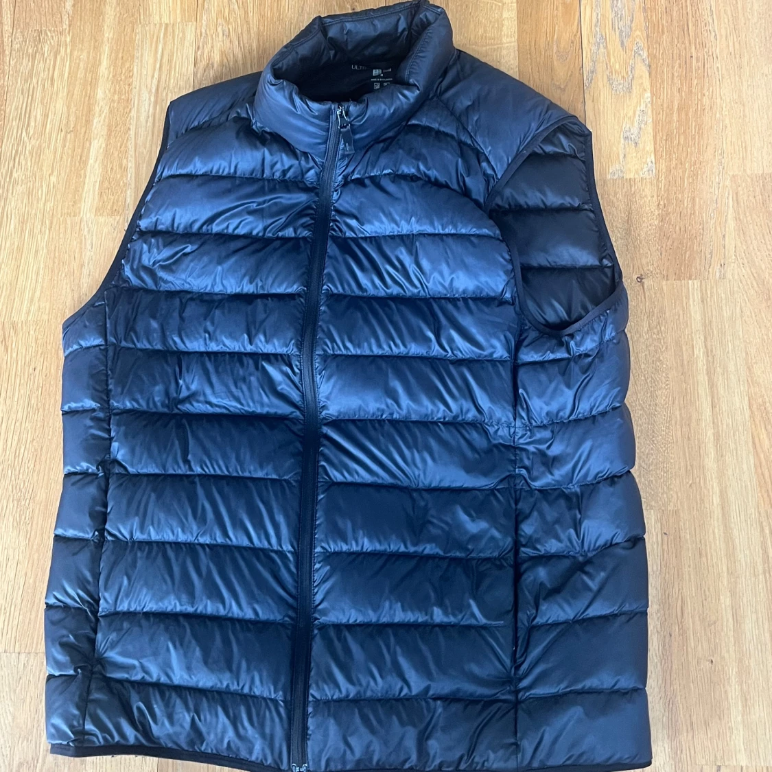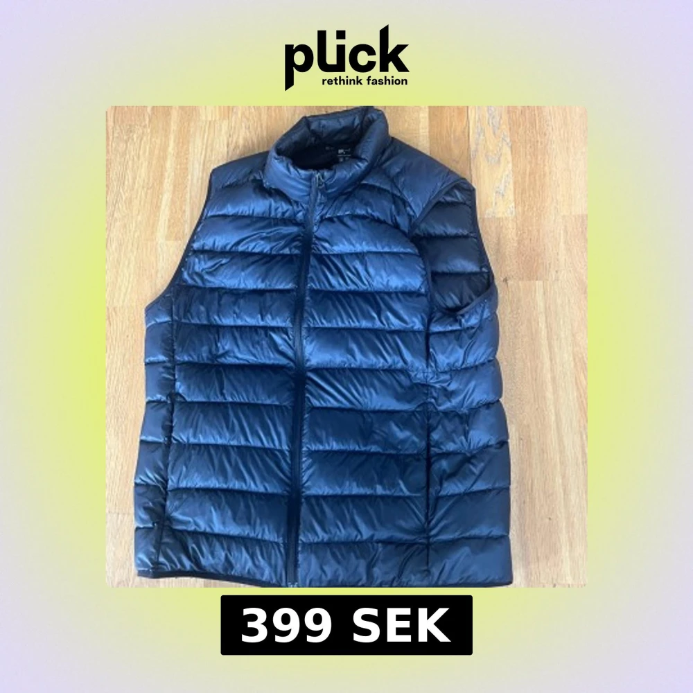 Snygg mörkblå dunväst från Uniqlo med quiltad design och hög krage. Västen har en hel dragkedja framtill och är perfekt att slänga över en hoodie eller tröja när det är kyligt ute. Enkel och stilren look som funkar till det mesta.