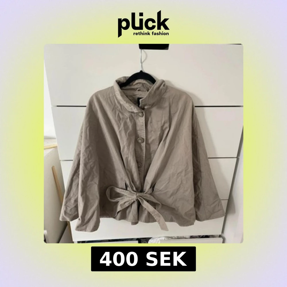 Säljer en beige capejacka med krage, stora knappar framtill och knytband i midjan. Jackan har vida ärmar och en lös passform som ger en avslappnad och trendig look. Perfekt för lager-på-lager under höst och vår. I trenchcoat stuket.