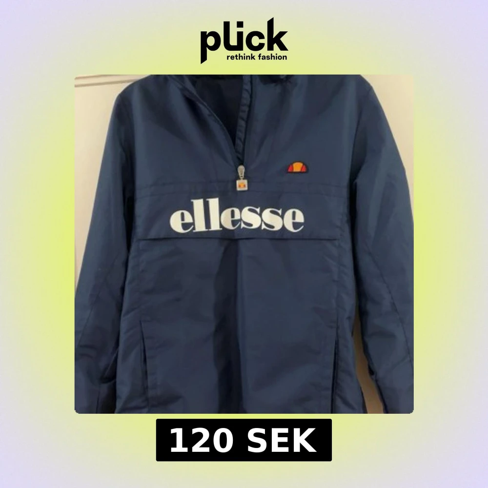 Säljer en blå vindjacka från Ellesse med stor vit logga framtill och halv dragkedja. Jackan har huva och praktiska fickor på sidorna. Perfekt för dig som gillar sportig stil och vill ha något snyggt och funktionellt.