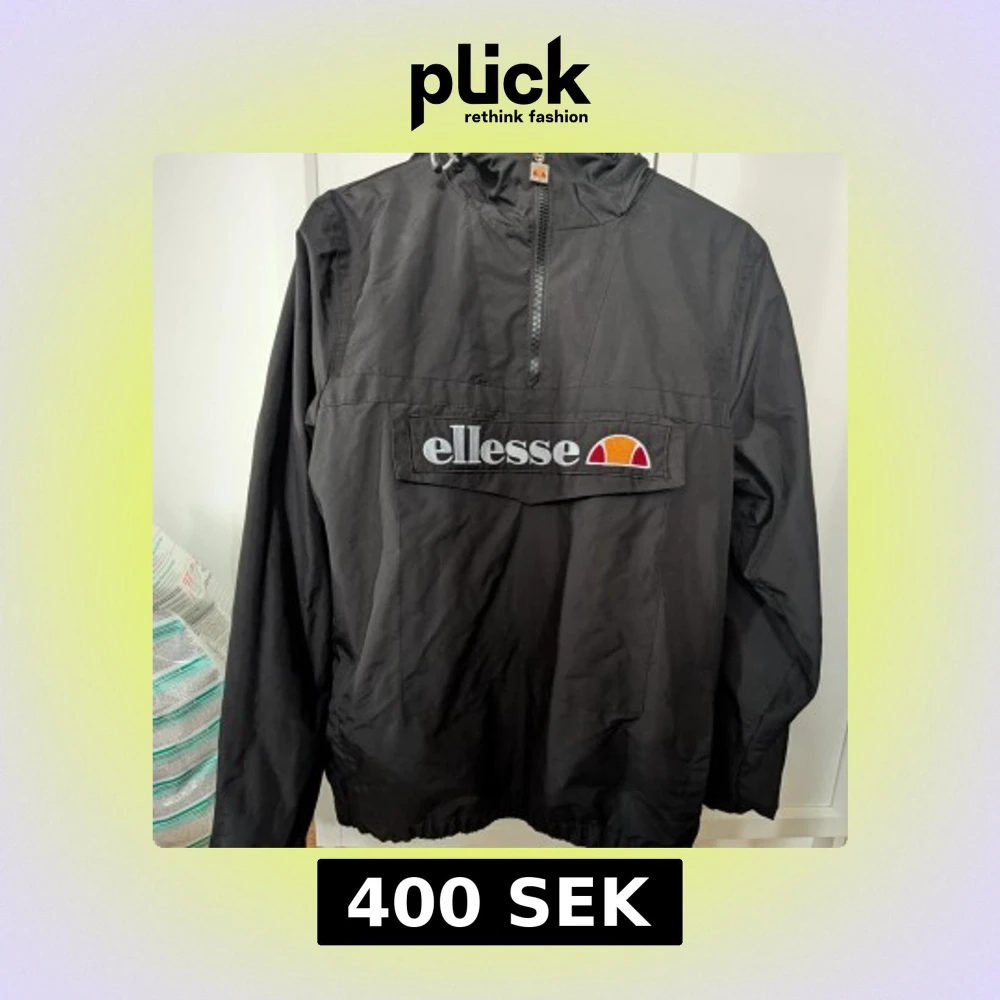 Svart vindjacka från Ellesse med stor logga framtill och patch på ärmen. Jackan har huva, half zip-dragkedja och elastiska muddar. Tillverkad i polyester och har en sportig, loose passform. Perfekt för dig som gillar streetwear och snygga detaljer. OBS. Är sydd i ena armhålan.
