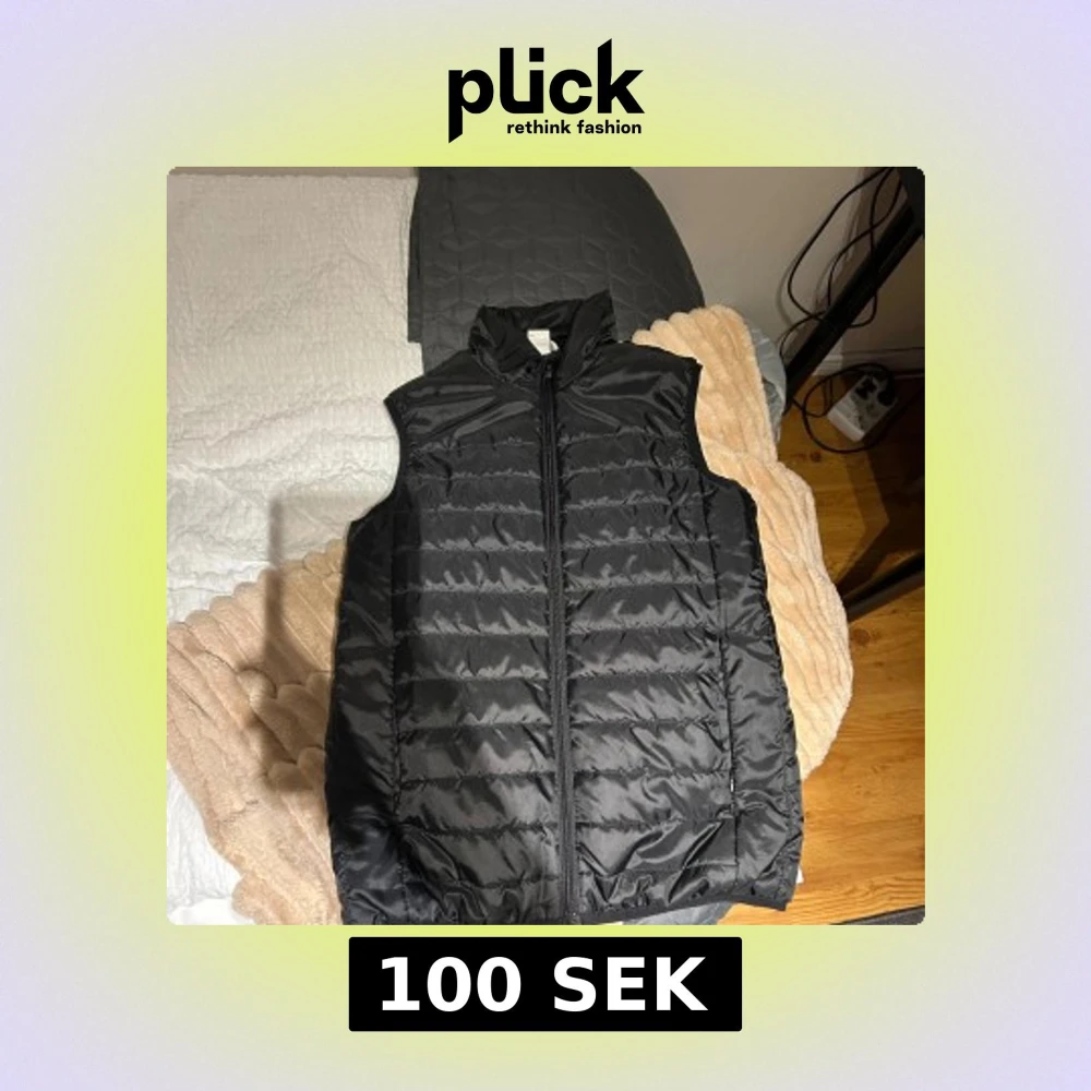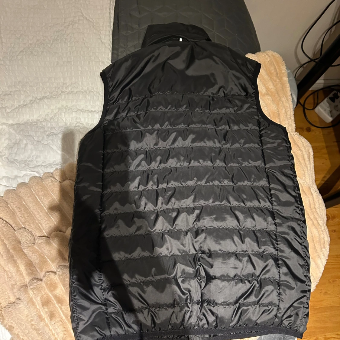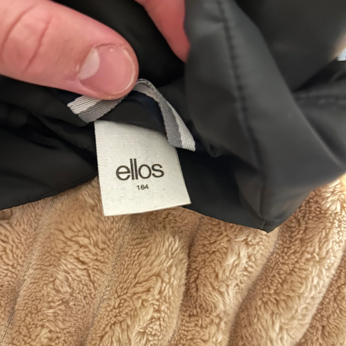 Svart dunväst från Ellos i storlek 164. Västen har horisontella quiltade sömmar, hög krage och dragkedja framtill. Materialet är syntet och designen är stilren och enkel, perfekt för lager-på-lager under kyliga dagar.