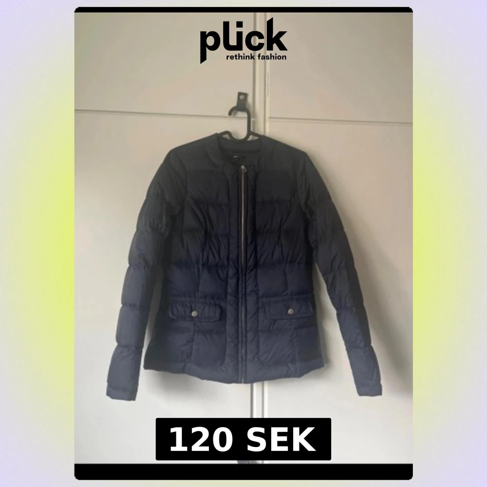 Snygg mörkblå dunjacka med raka linjer och quiltad design. Jackan har rund hals, två fickor med tryckknappar och en smidig dragkedja framtill. Perfekt för kyliga dagar och enkel att matcha med olika outfits.