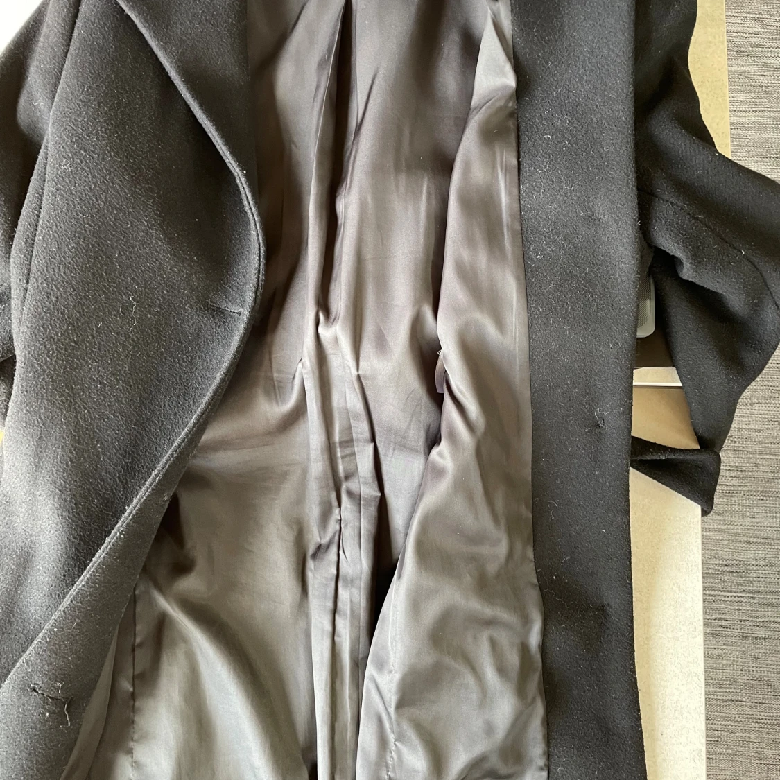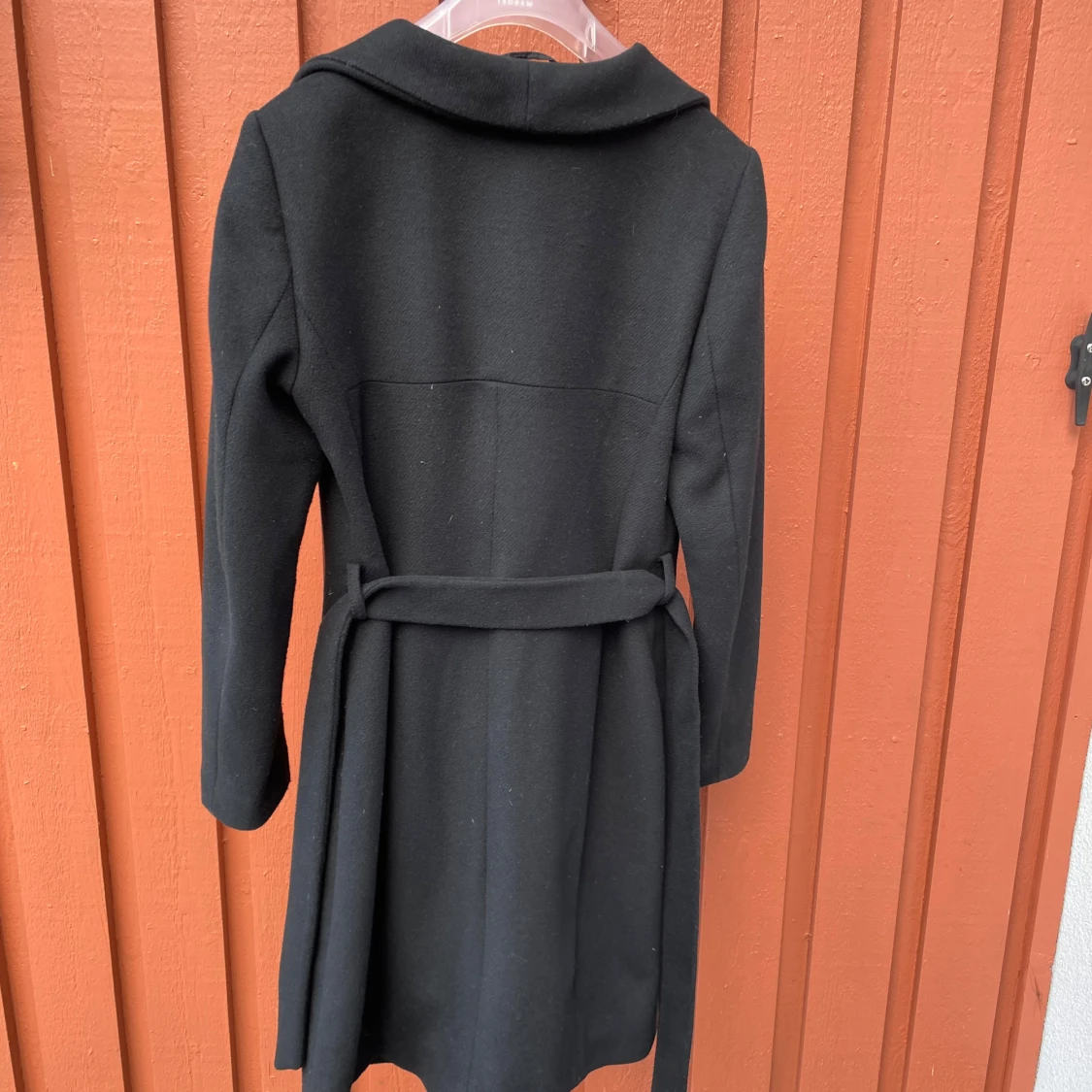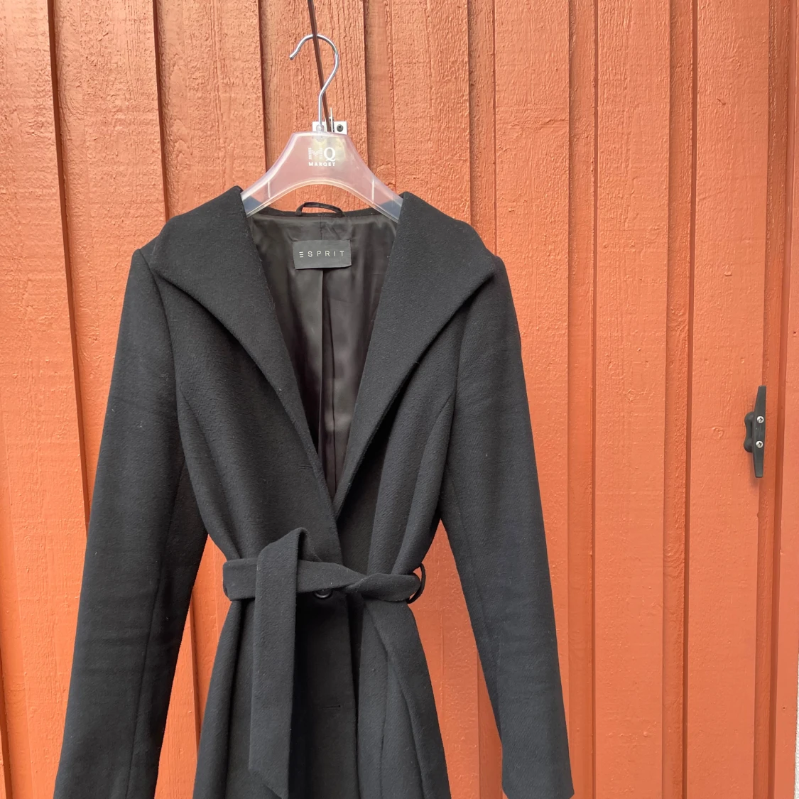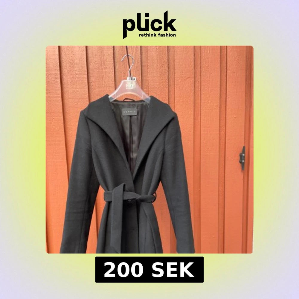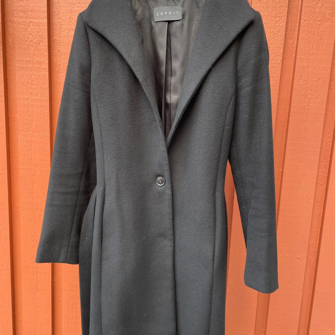 Stilren svart kappa från Esprit med snygg krage och knytbälte i midjan. Långärmad och med en enkel knappstängning framtill. Kappan har en klassisk siluett och är tillverkad i ett mjukt ullmaterial som håller dig varm under kyliga dagar. Kappan är i bra till mycket bra skick.