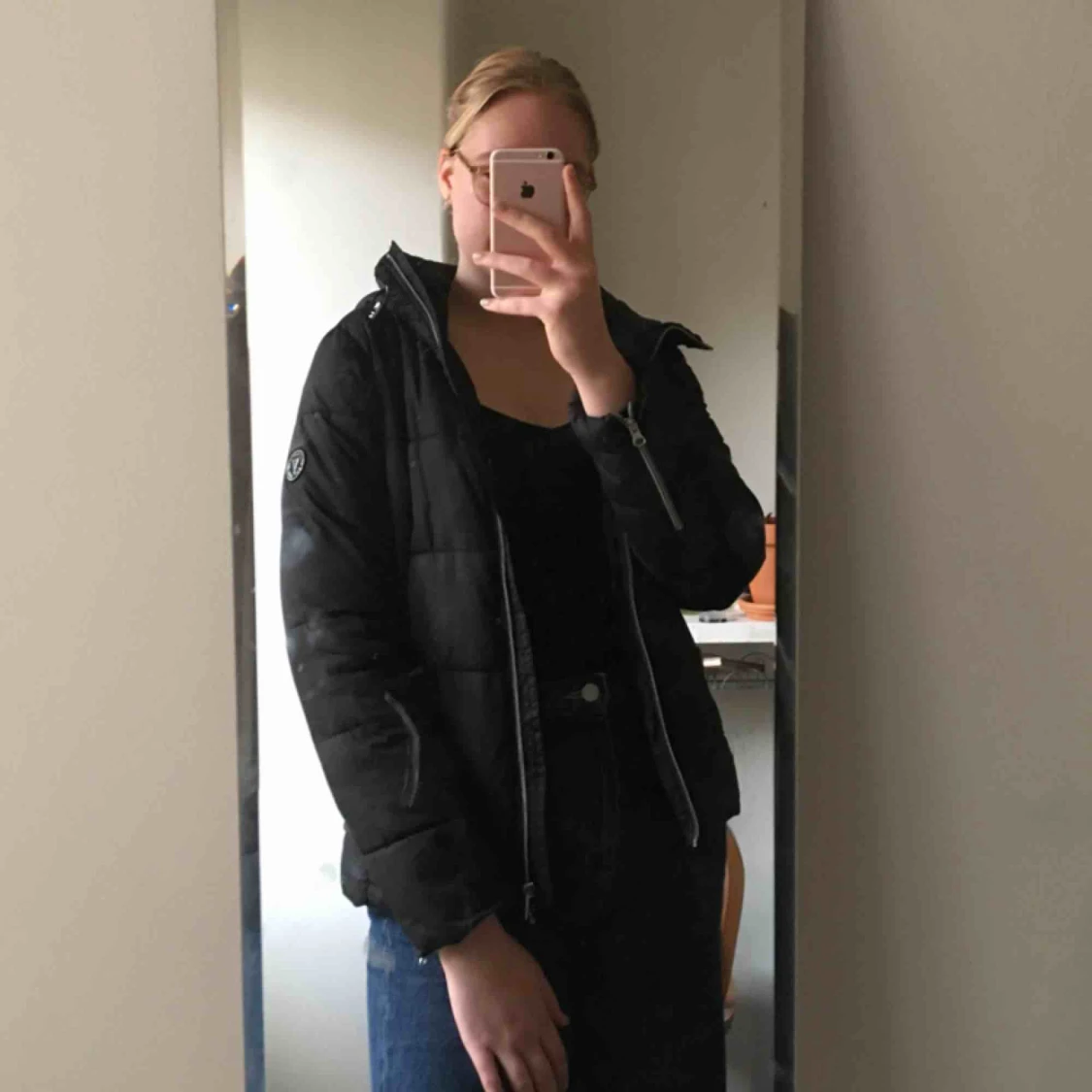 Vinterjacka med luva. Svart med vinrött innertyg. Ungefär storlek 36-38.