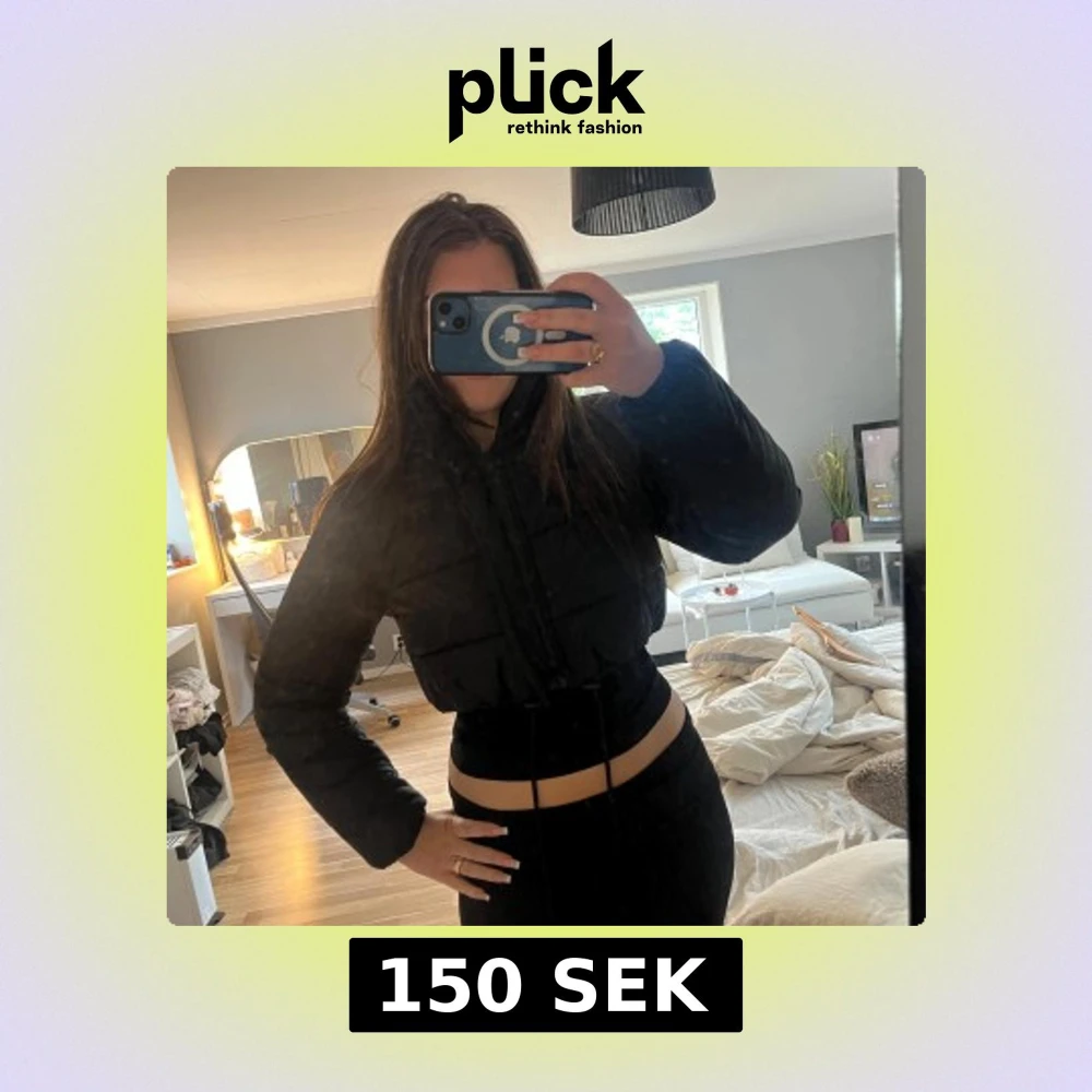 Svart croppad pufferjacka från SHEIN med hög krage och långa ärmar. Jackan har dragkedja framtill och snörning i nederkant för att justera passformen. Perfekt för dig som gillar en trendig och sportig look.