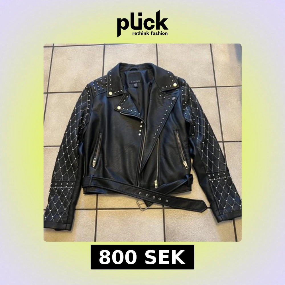 Snygg svart skinnjacka från Amisu med coola nitar och quiltade detaljer på ärmarna. Jackan har dragkedja och ett bälte i midjan för extra stil. Perfekt för att ge din outfit en edgy touch!