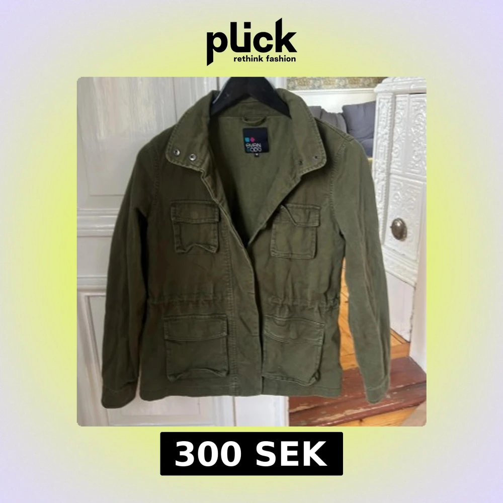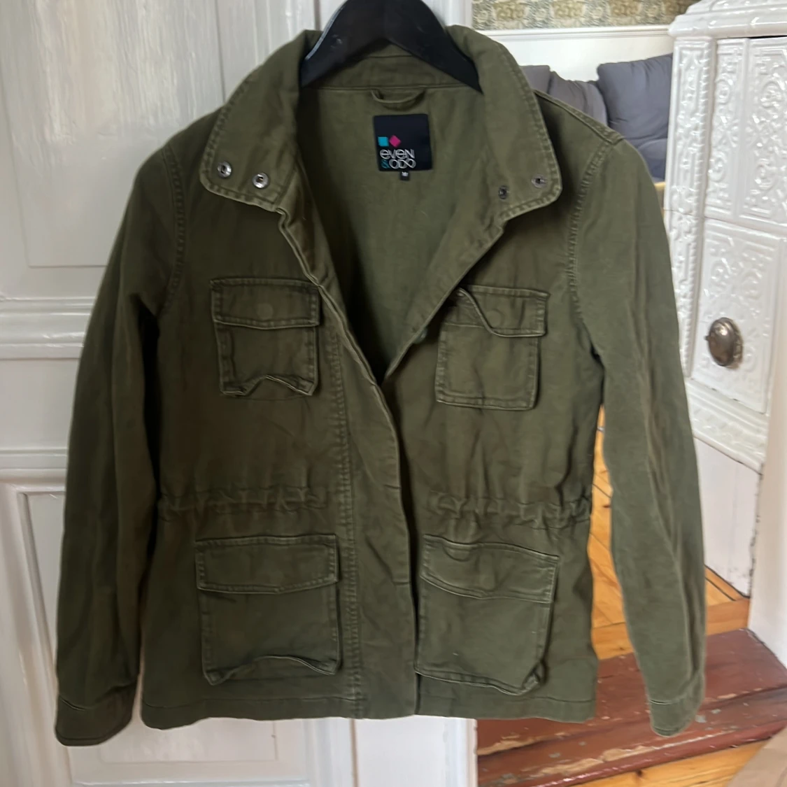 Snygg olivgrön parkajacka från Even&Odd med fyra stora fickor framtill och markerad midja. Jackan har hög krage med tryckknappar och är perfekt för lager-på-lager-stil. Sitter som xs.