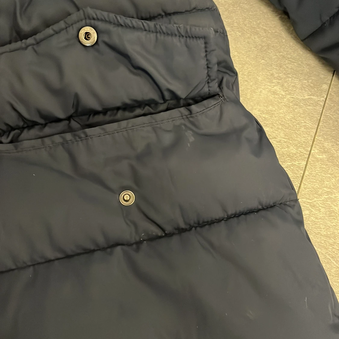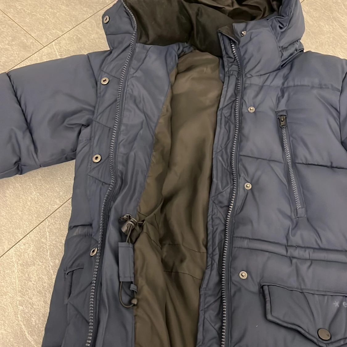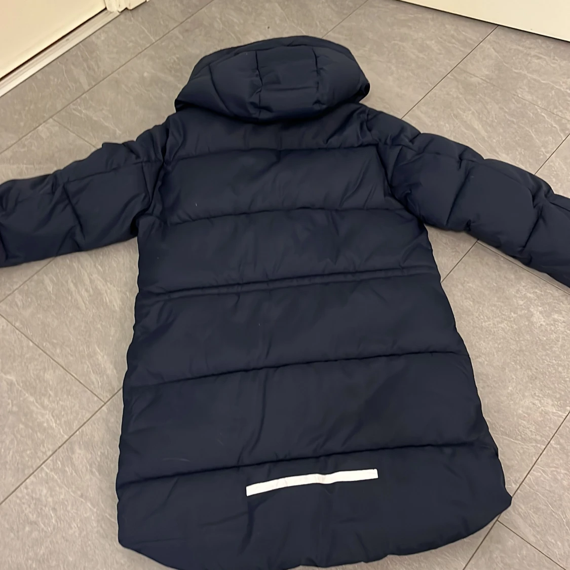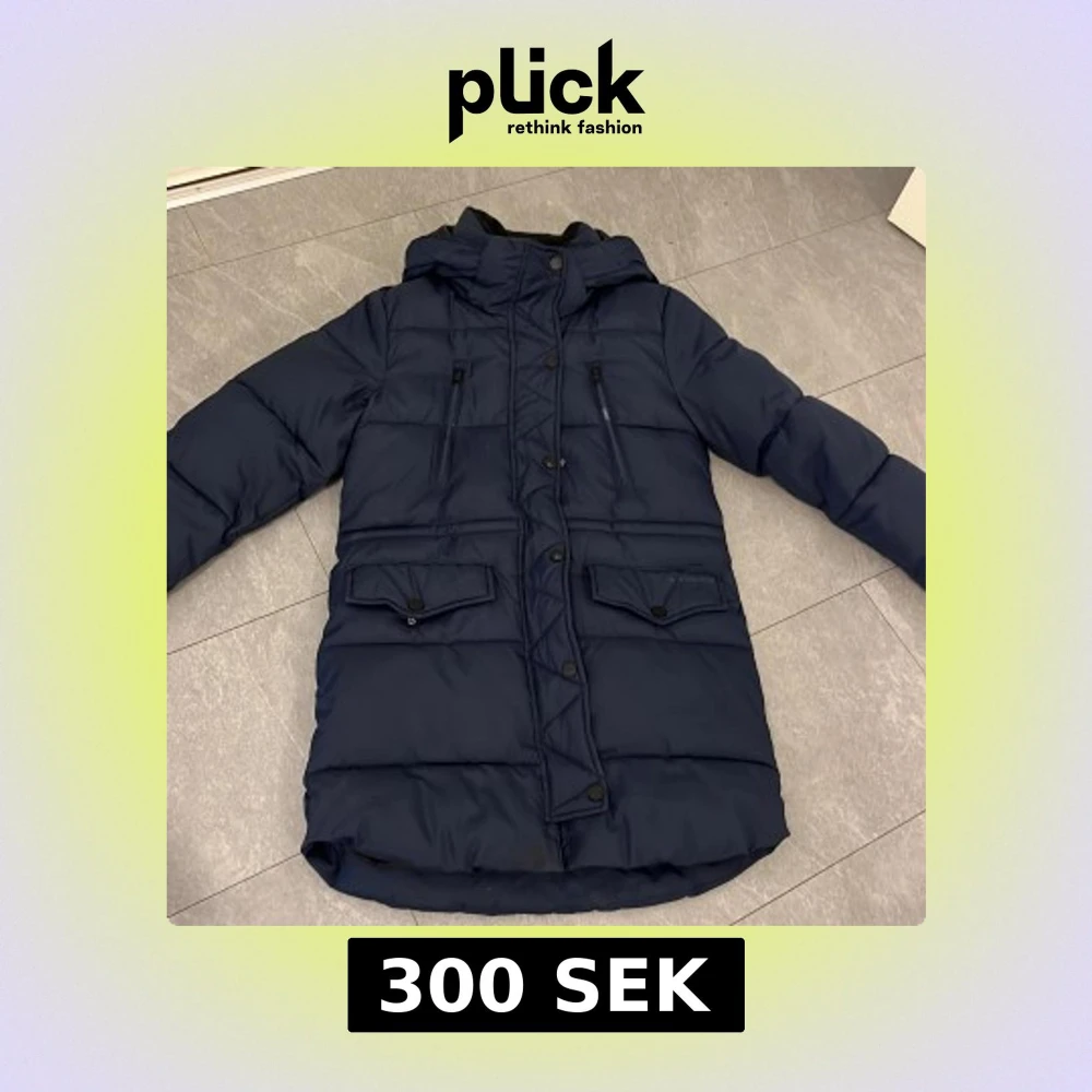 Säljer en mörkblå lång dunjacka med huva och flera fickor med både dragkedja och knappar. Jackan har en pufferstil och är perfekt för kalla dagar. Reflextape baktill för extra synlighet. Stängs med dragkedja och knappar framtill.
