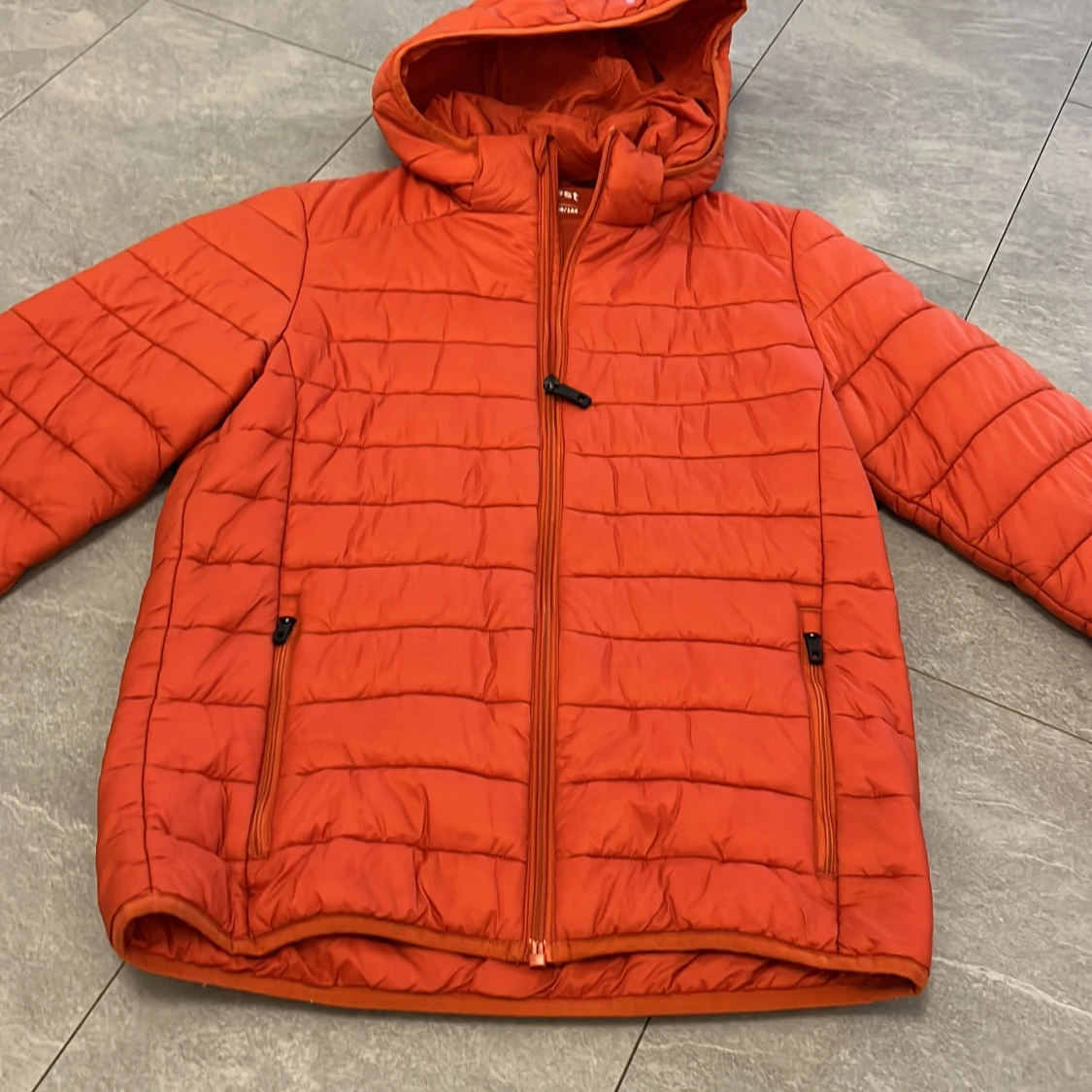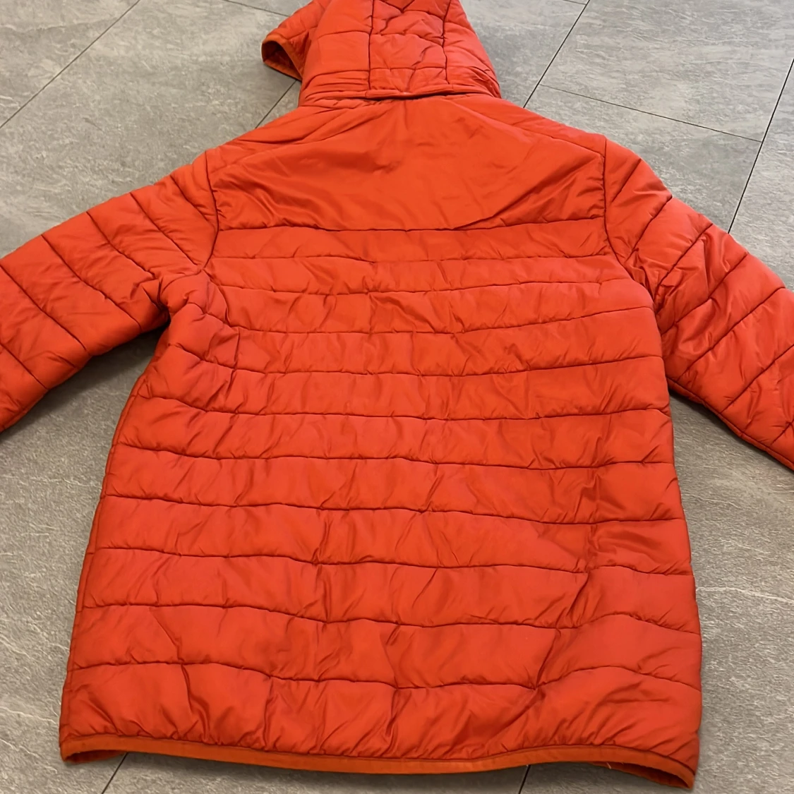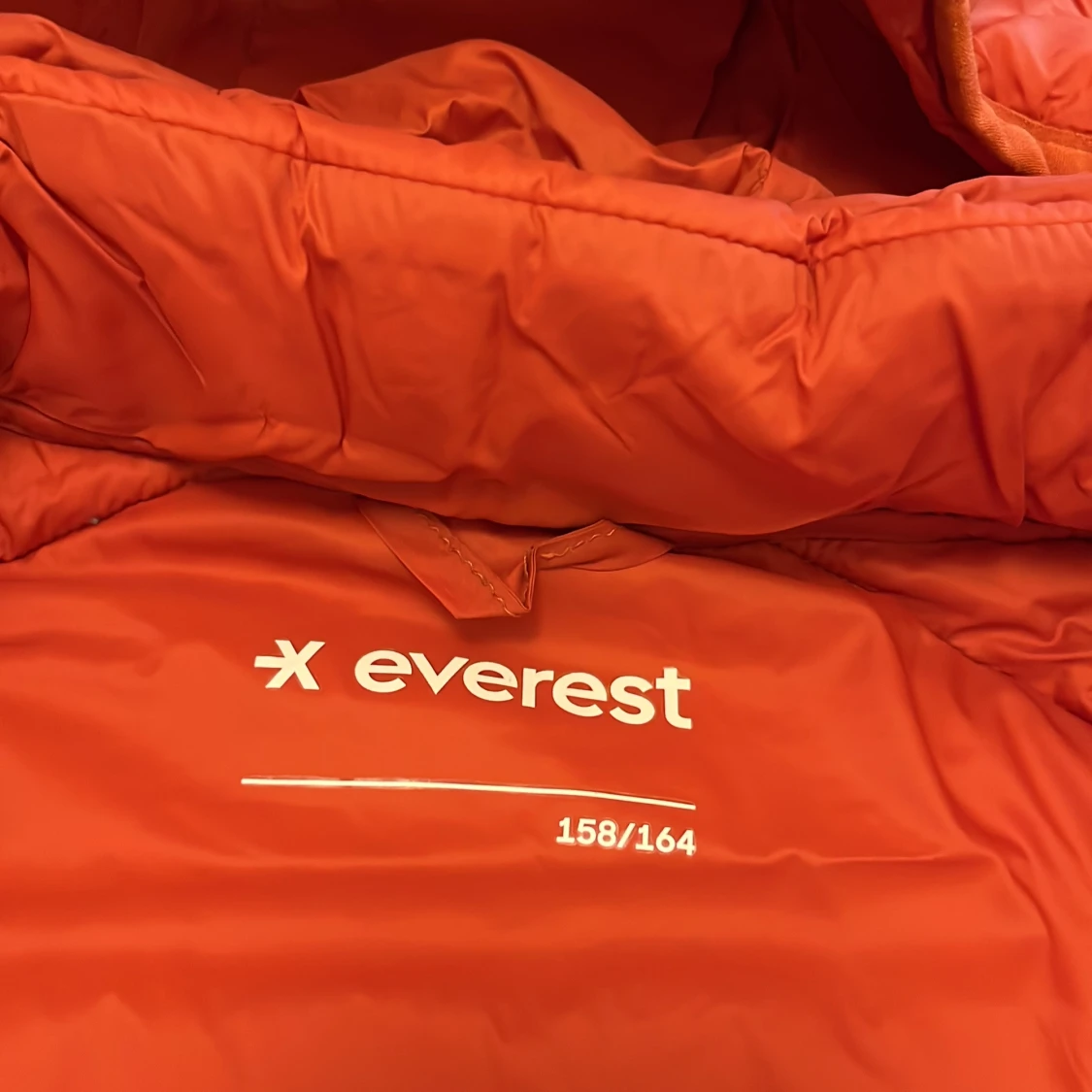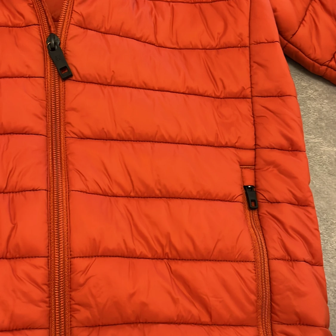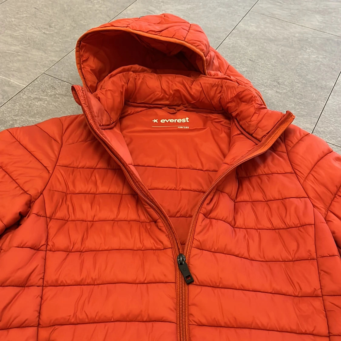Säljer en orange pufferjacka från Everest med huva och dragkedja framtill. Jackan har två fickor med dragkedja och quiltad design. Perfekt för kyligare dagar.