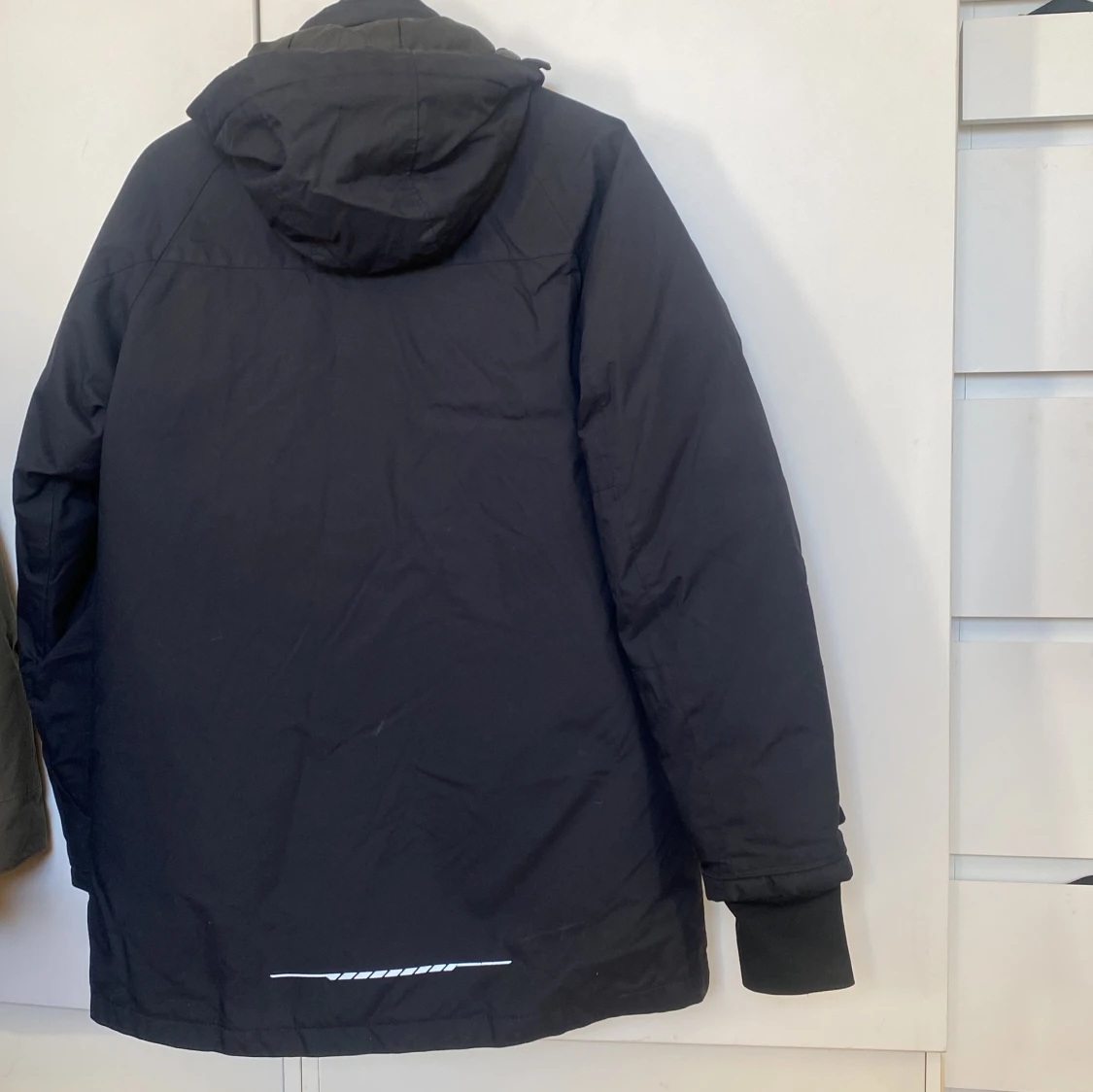 Säljer en svart vinterjacka med huva och dragkedja. Jackan har långa ärmar och praktiska fickor med knappar framtill. Stl 164 ( small)