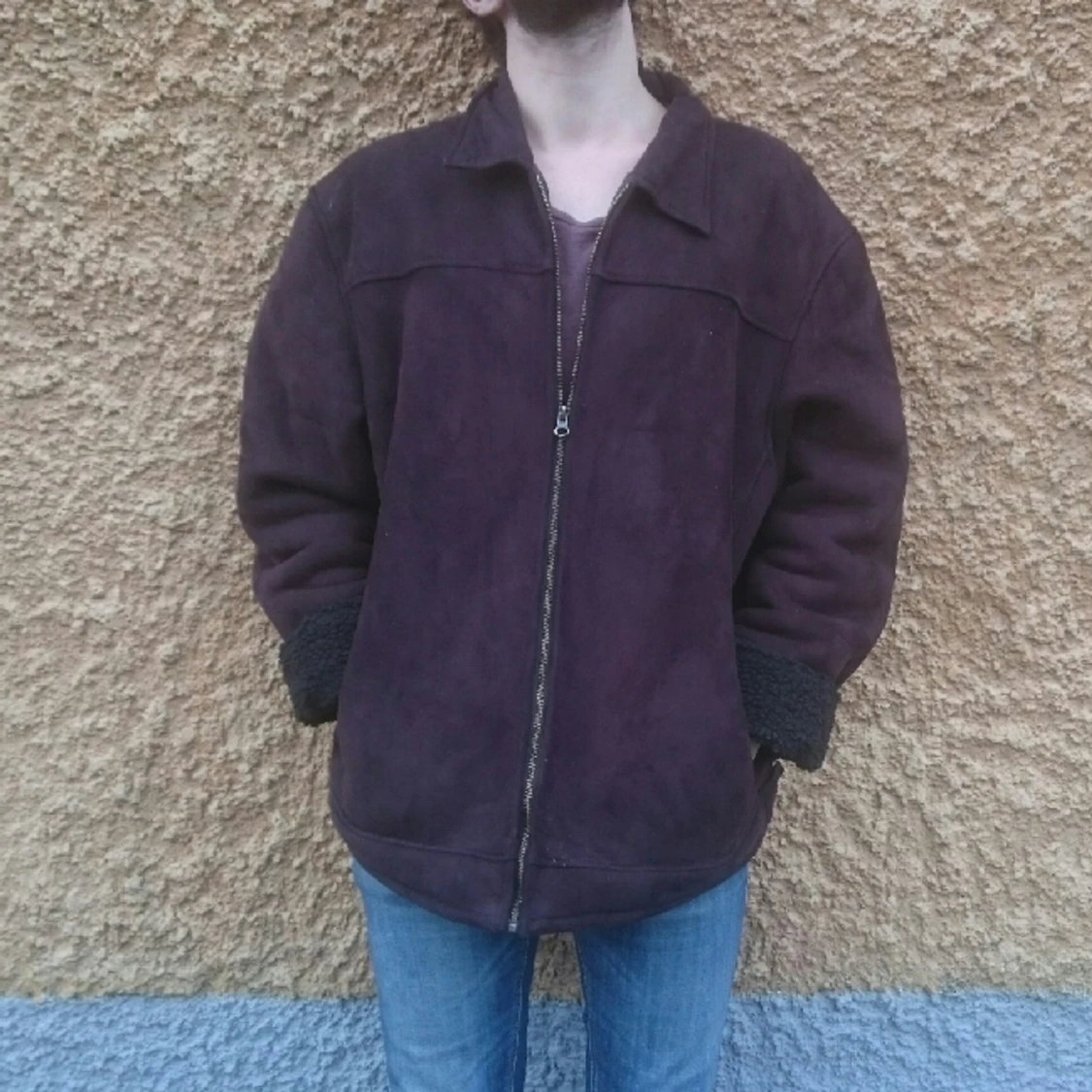 Varm mörkbrun jacka i fuskmocka med pälsliknande foder.