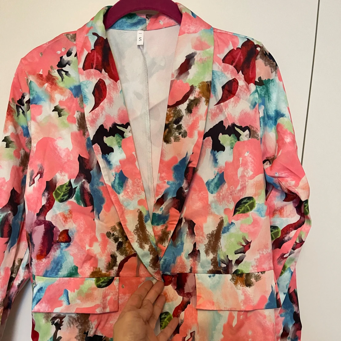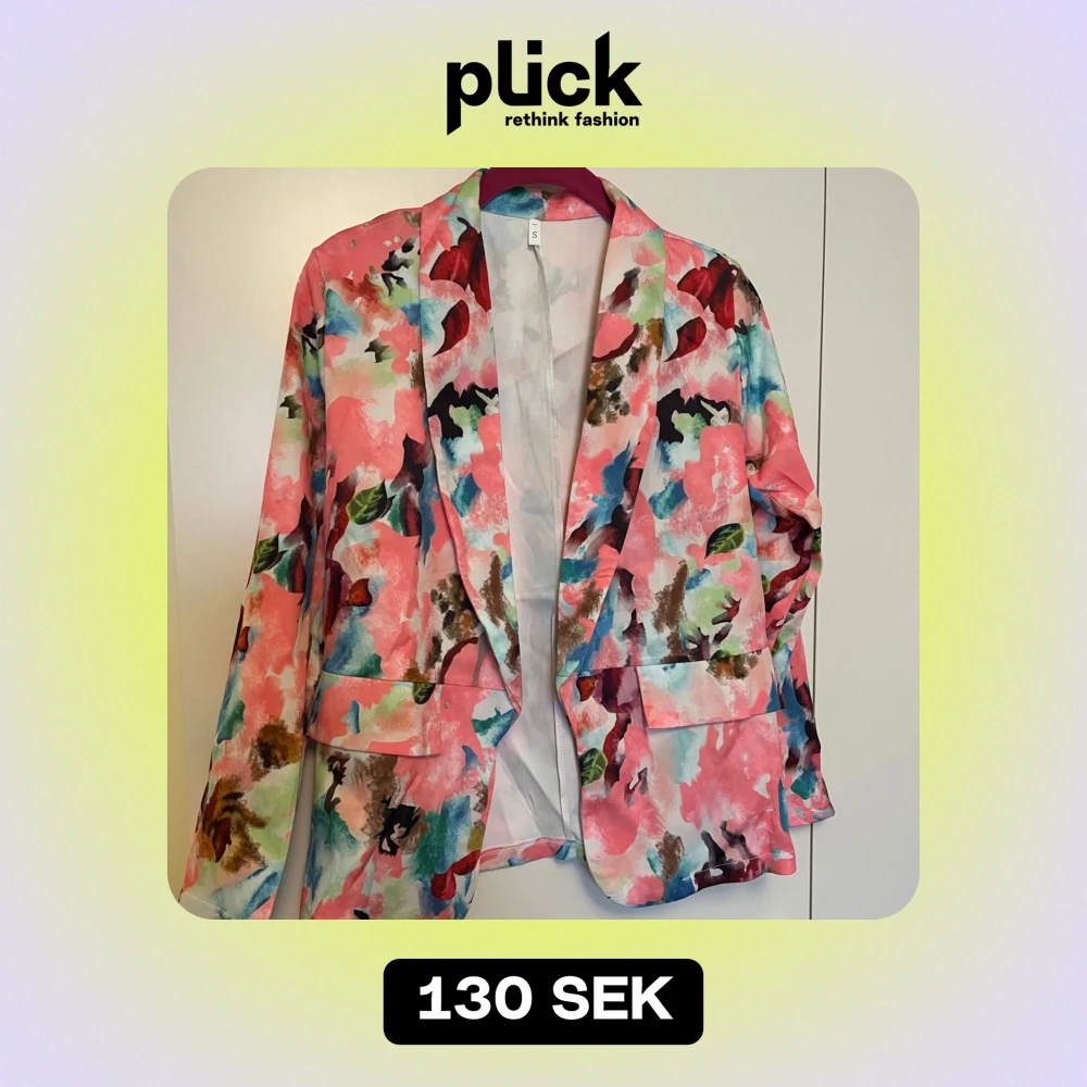 Säljer en superfin kavaj i storlek S med ett färgglatt blommigt mönster. Perfekt för att liva upp vilken outfit som helst! Kavajen har långa ärmar och en normal passform. Den är idealisk för både vardags och fest. Helt ny🌸