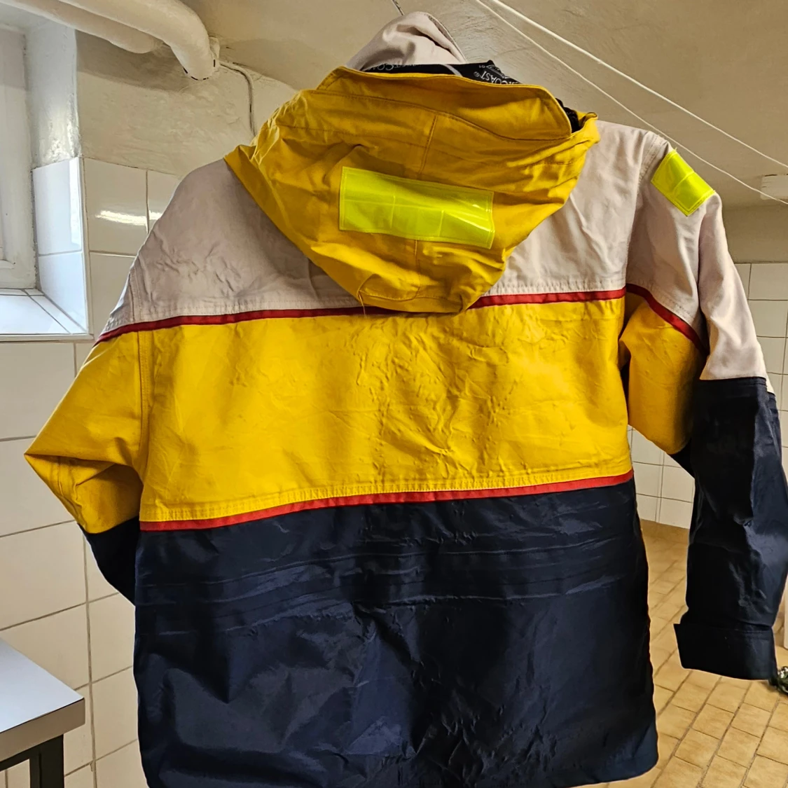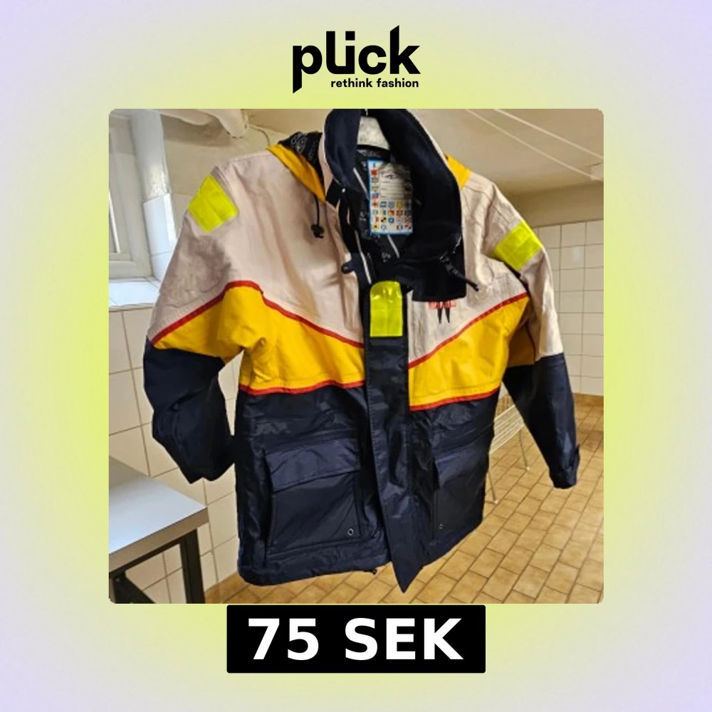 Cool vindjacka i färgerna gul, marinblå och beige med röda detaljer. Jackan har huva, stora fickor och flera reflexdetaljer på axlar och huva. Perfekt för dig som vill sticka ut och synas. Materialet är syntet och jackan har dragkedja framtill.