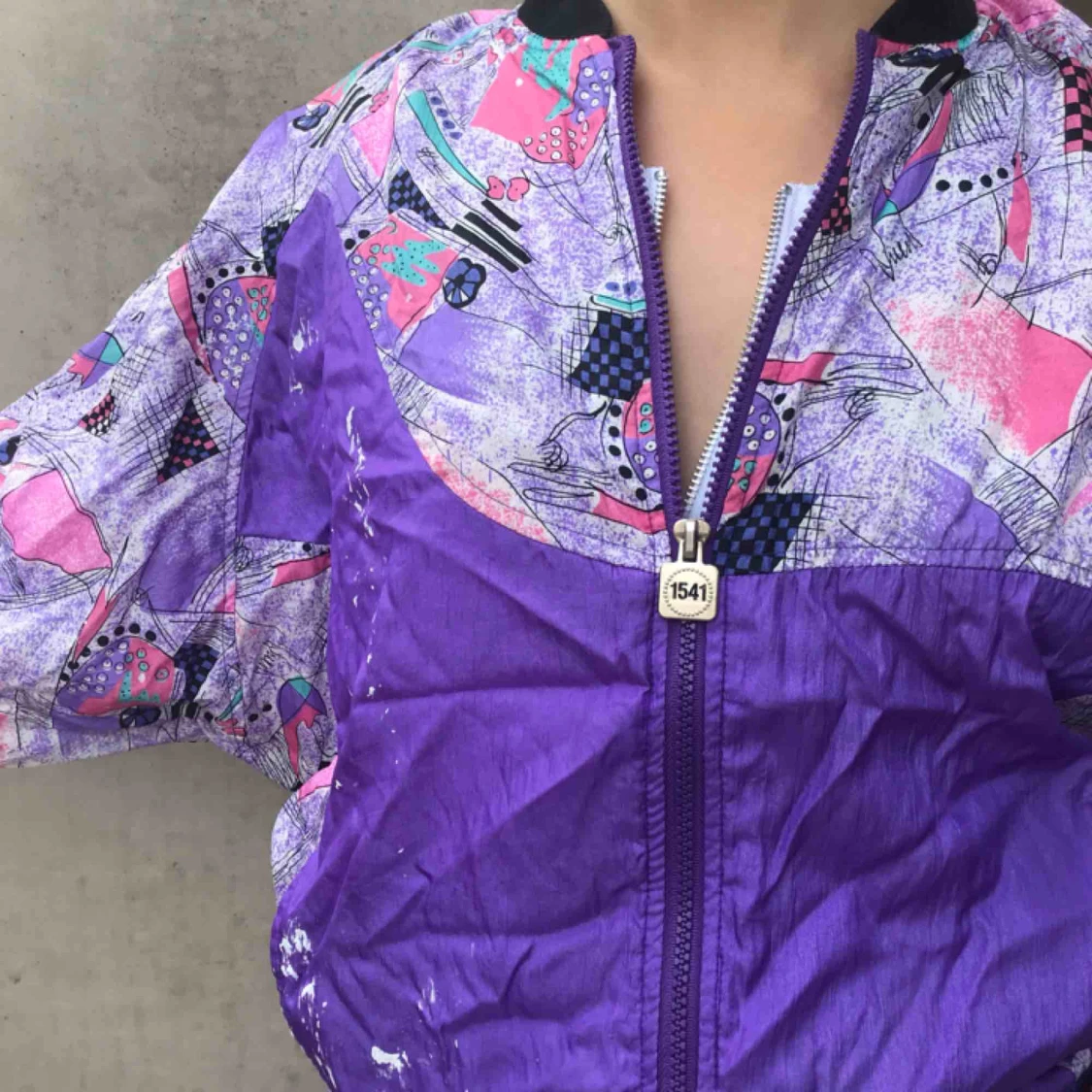 Snygg jacka köpt på beyond retro! Står ingen storlek men passar någon som har S/M. Lite färgstänk på framsidan men det passar bra in🌭 riktigt härliga färger och mjukt tyg på insidan