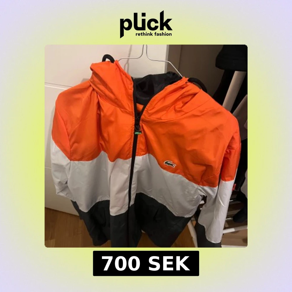 Säljer en snygg vindjacka från Lacoste i orange, vitt och svart. Jackan har huva, dragkedja framtill och klassisk Lacoste-logga på bröstet. Perfekt för dig som vill sticka ut med en sportig och fräsch look.