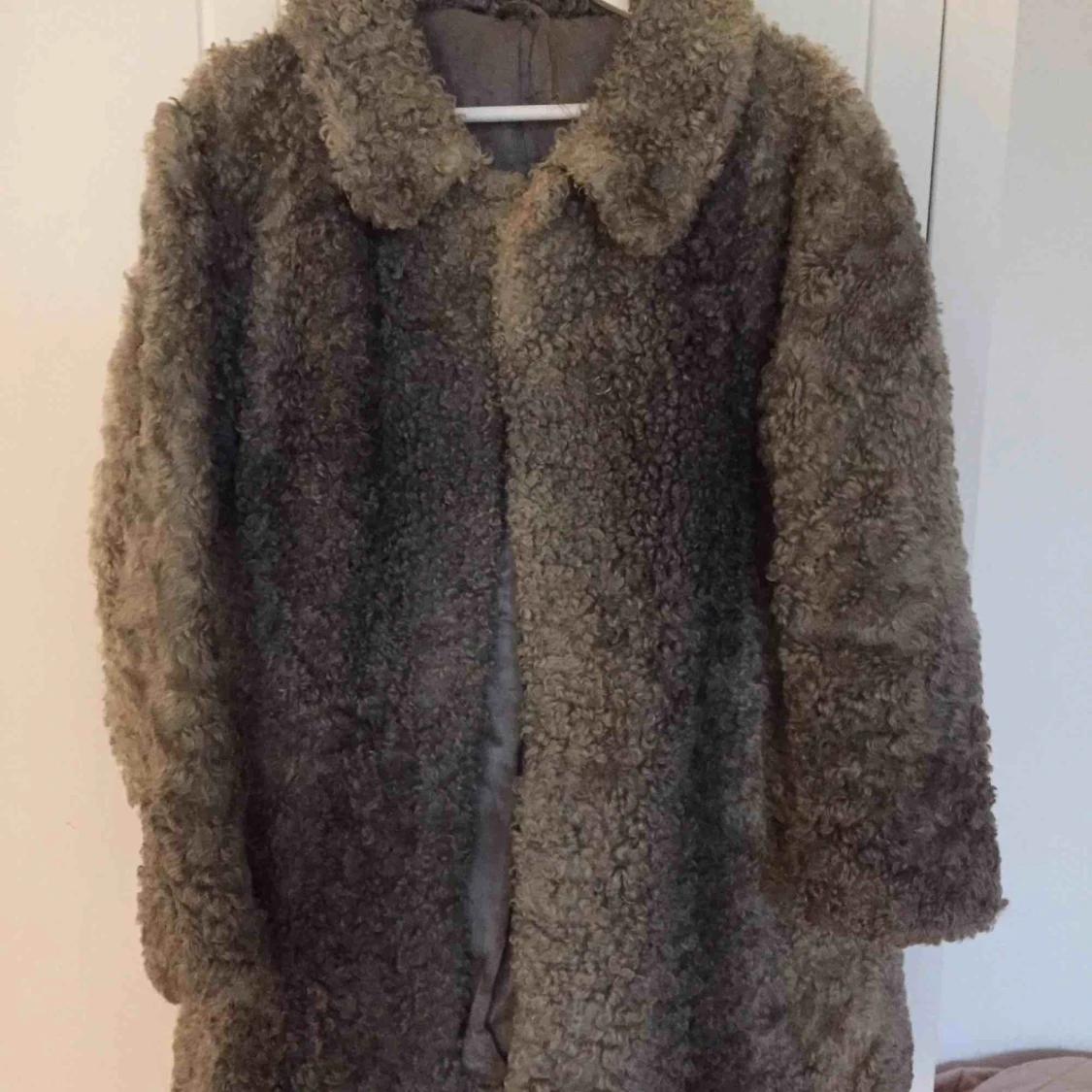 Unik vintage silvrig kappa i fårull. Behöver lappas lite på axeln men skickar med extra fårskinn i samma material och färg.