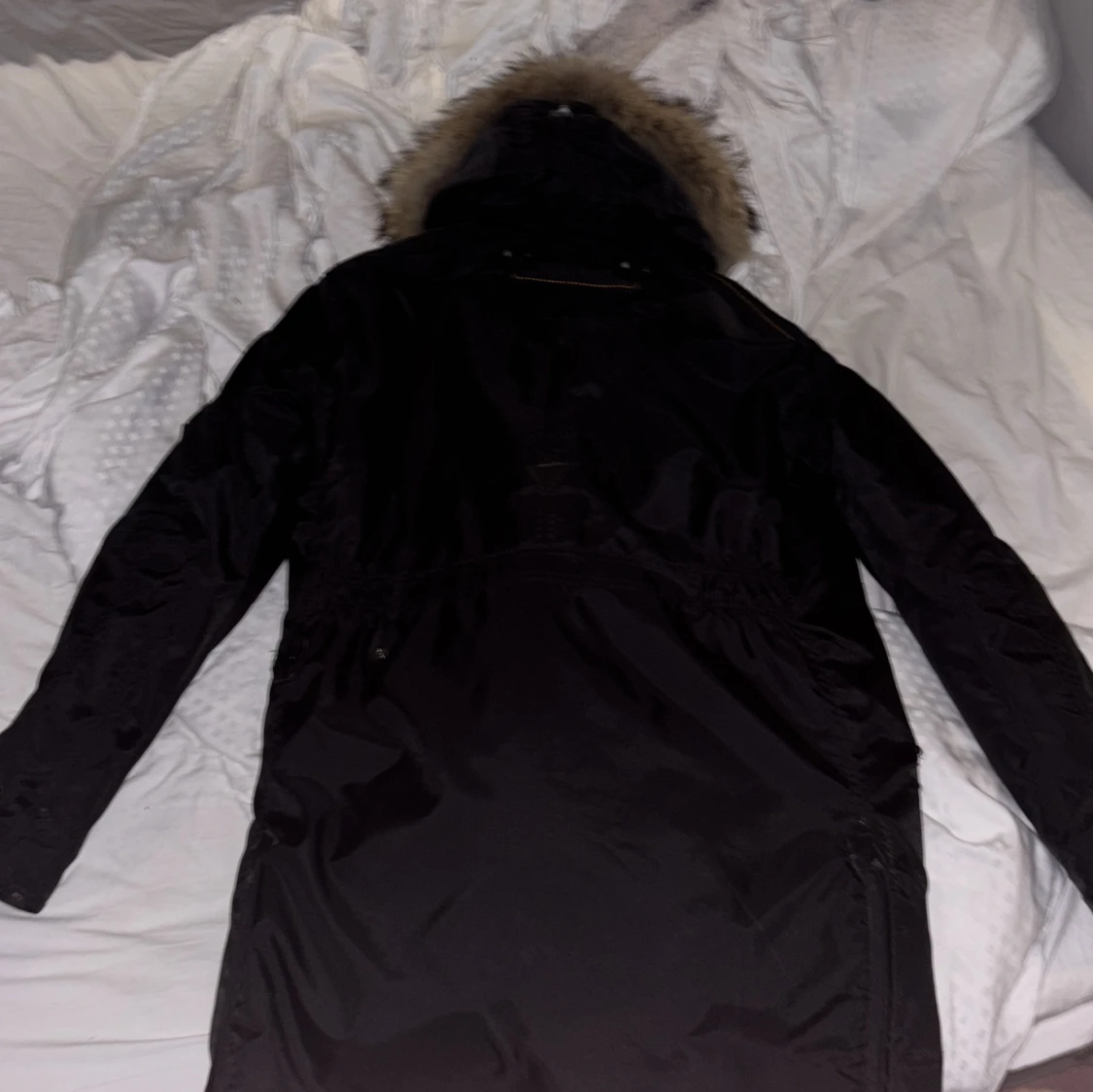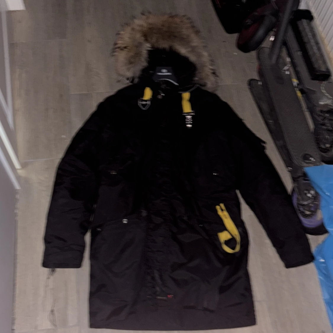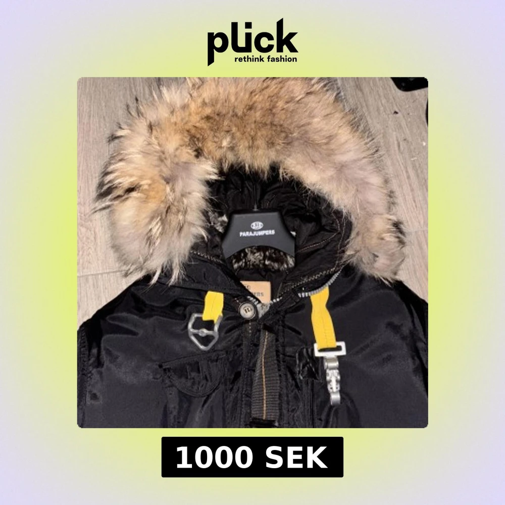 Säljer en svart Parajumpers parkas med stor fluffig päls på huvan och coola gula detaljer. Jackan har dragkedja, knappar och flera fickor. Perfekt för kalla dagar och har en riktigt snygg streetstil.