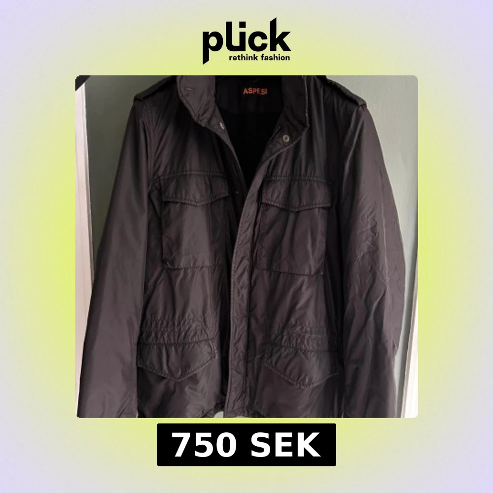 Svart vindjacka från Aspesi i storlek M. Jackan har axelklaffar och dragkedja samt knappar. Jackan är gjord i ett lätt, syntetiskt material som ger en clean och stilren look. Små defekter på en knapp och intill i jackan (se bilderna)