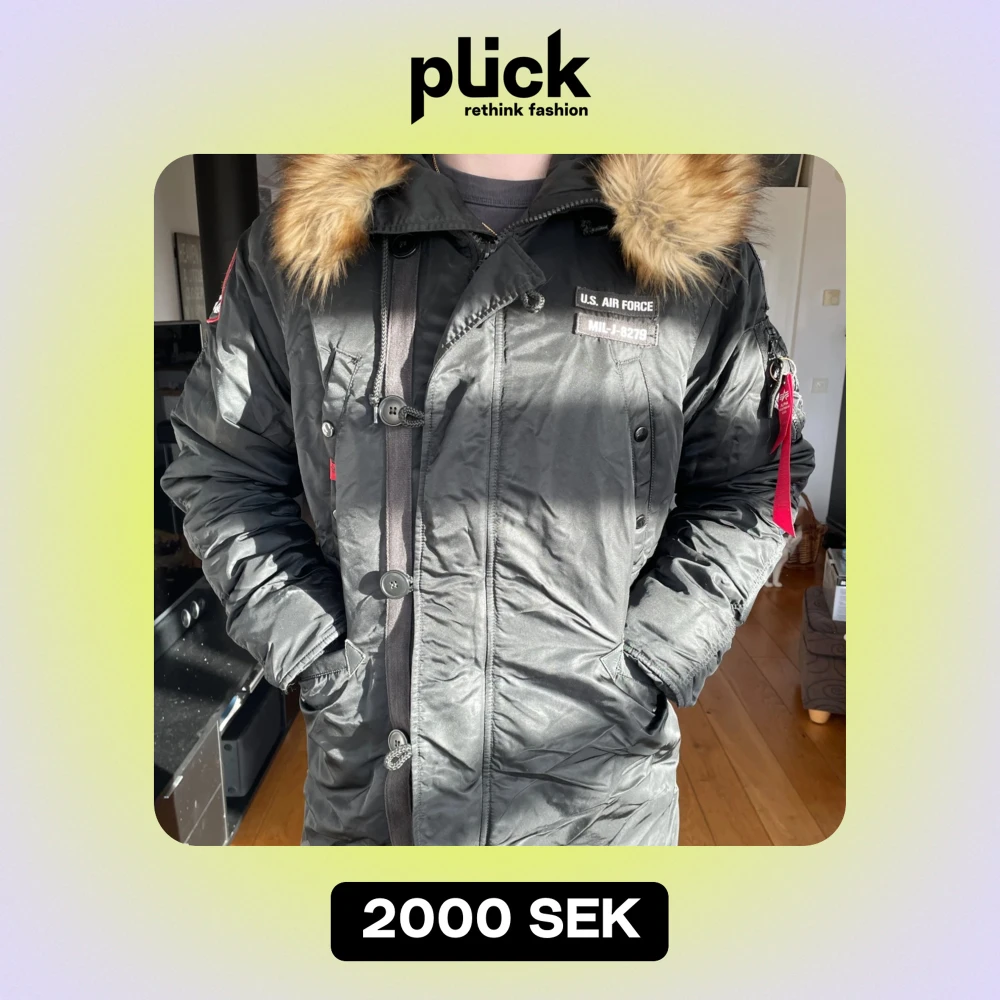 Svart fodrad vinterjacka från alpha industries med fejkpälskrage. Röda och vita detaljer. Fickor på framsida och insida, två på magen, två på bröstet och en på insidan. Dragkedje och knapp förslutning. Går strax under rumpan (jag är 188cm). Storlek L