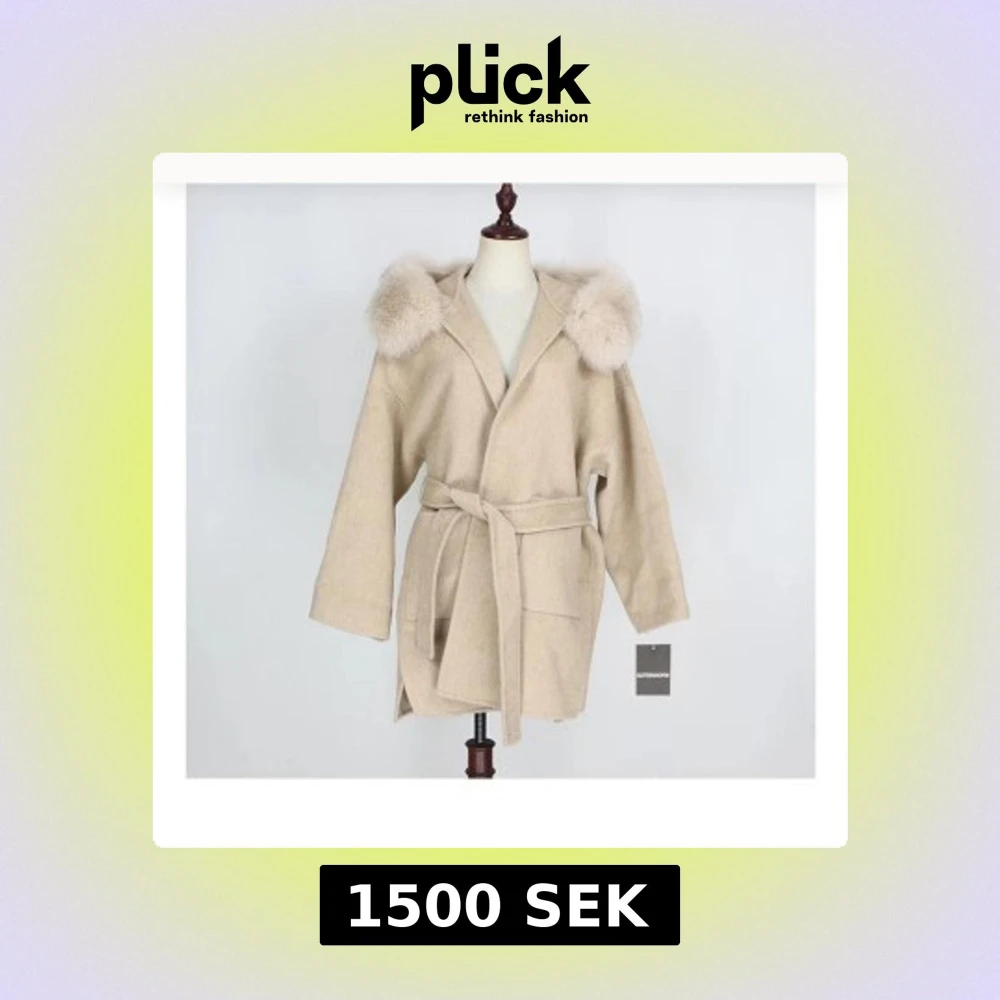 Elegant beige kappa med pälskrage och knytskärp i midjan köpt från Femenina of Sweden. Jackan har långa ärmar och två stora fickor framtill. Perfekt för att hålla sig varm och stilren under kyliga dagar.