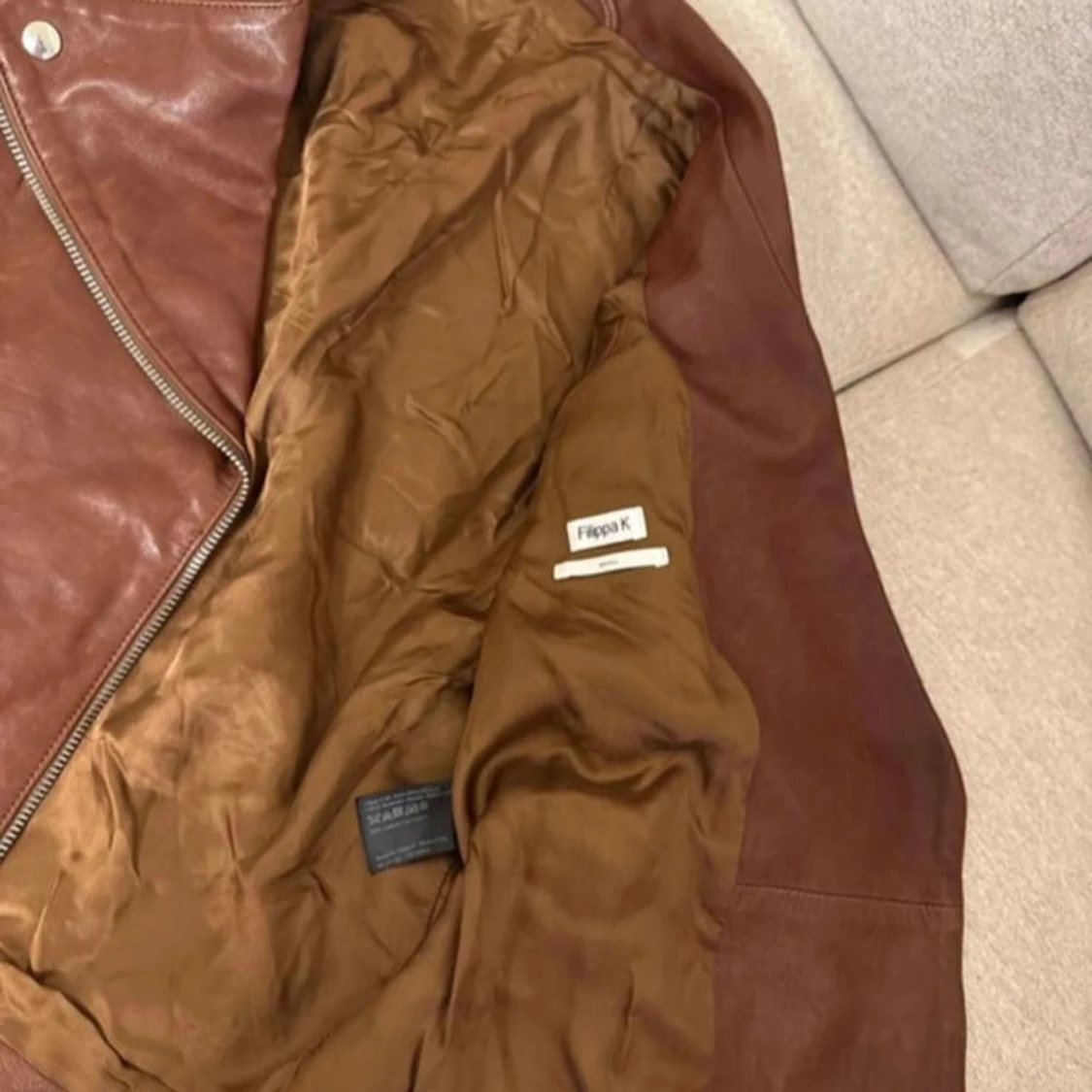 Snygg brun skinnjacka från Filippa K med klassisk bikerstil. Jackan har flera silvriga dragkedjor, bred krage och coola detaljer. Perfekt för dig som vill ha en tidlös och edgy look. Fodrad insida för extra komfort.
