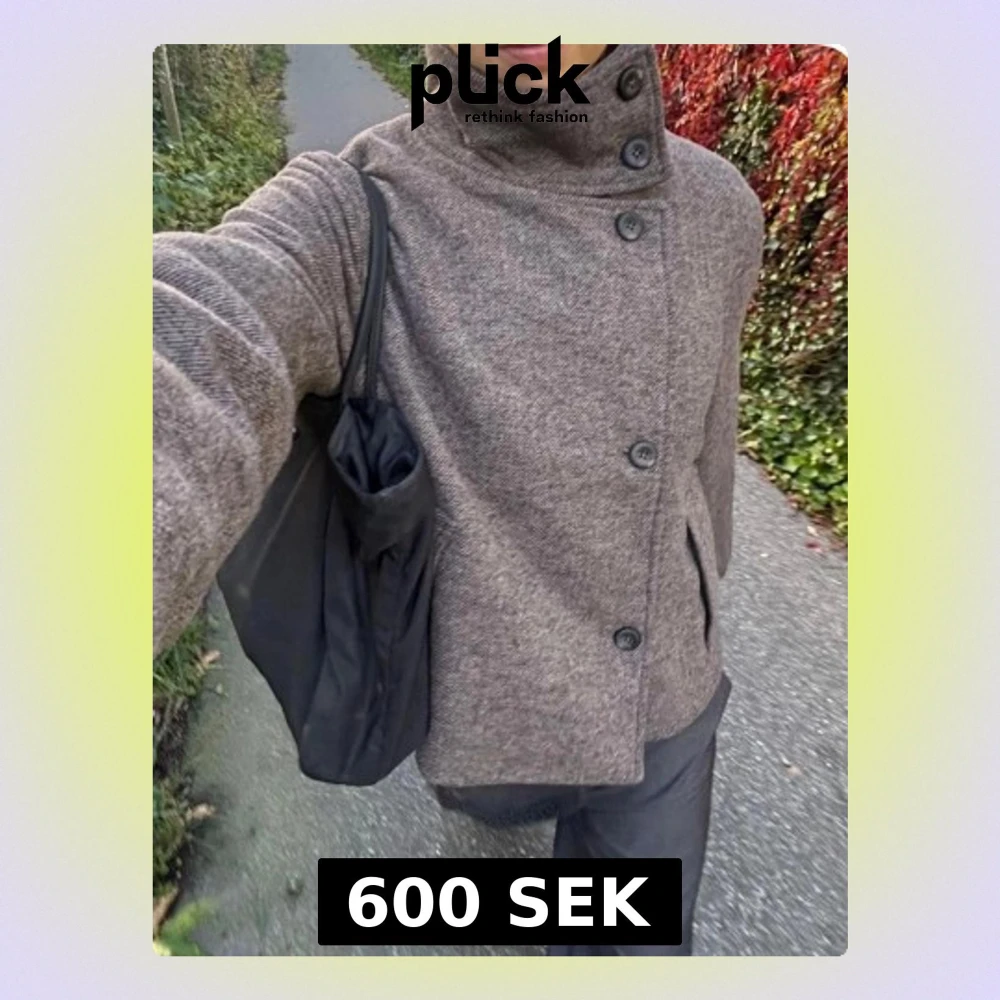 Säljer en brun jacka i ull med snygg hög krage och asymmetrisk knäppning med fyra knappar framtill. Jackan har en rak, lite boxig passform och två fickor på sidorna. Perfekt för dig som gillar stilren och enkel design. Den är varm och passar alla väder