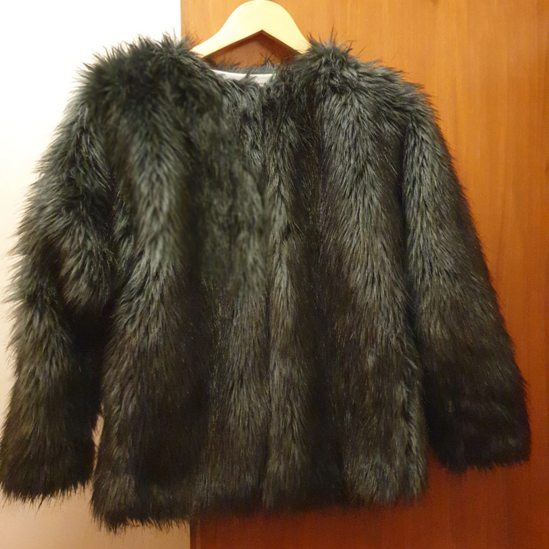 Grågrön fakepälsjacka, fin kvalité. Jackan har två fickor på sidorna och tre spännen. Perfekt till höst- och vinterfesten. Begagnad men felfri.