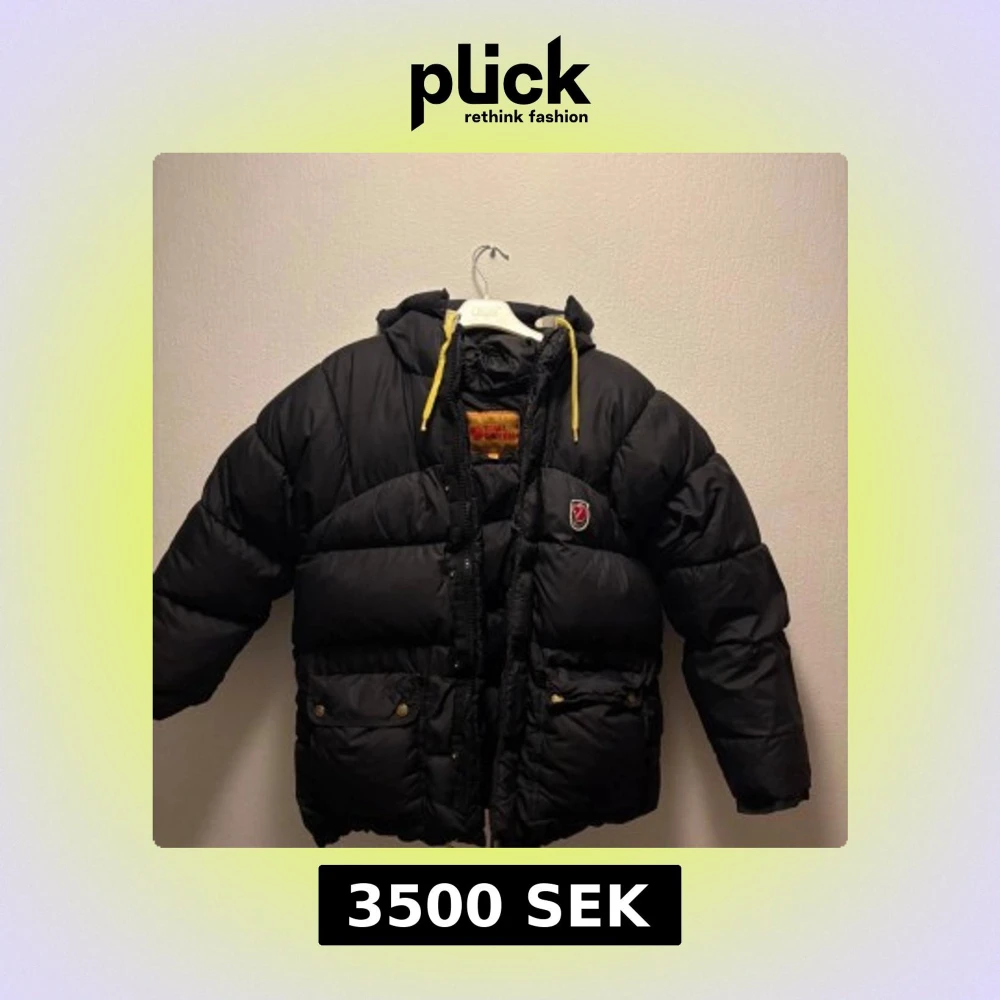 Säljer en svart dunjacka från Fjällräven med huva och gula snören. Jackan har en broderad logotyp på bröstet och praktiska fickor med knappar. Perfekt för kalla vinter dagar. En liten bit där den är ihopsydd vilket inte syns.Storlek XXS. PRIS KAN DISKUTERAS! Kan även byta mot en annan Fjällräven jacka