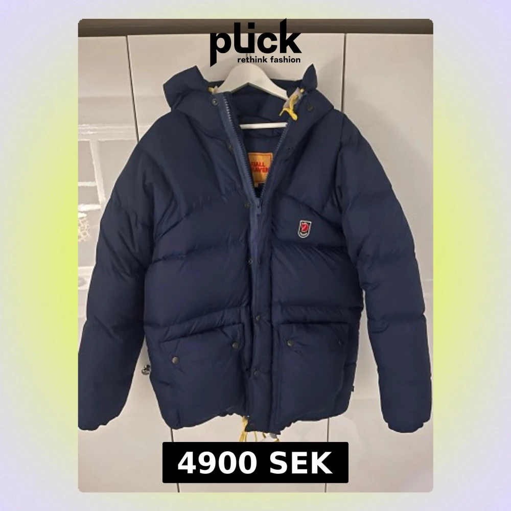Säljer en mörkblå dunjacka från Fjällräven i storlek XXS. Jackan har huva, gula snören, stora fickor med knappar och klassisk Fjällräven-logga på bröstet. Perfekt för kalla dagar och riktigt skön att bära. Medföljer matchande påse. Mycket gott skick & varsamt använd ett fåtal gånger. Inga märken eller defekter. Ny pris 9 999kr.
