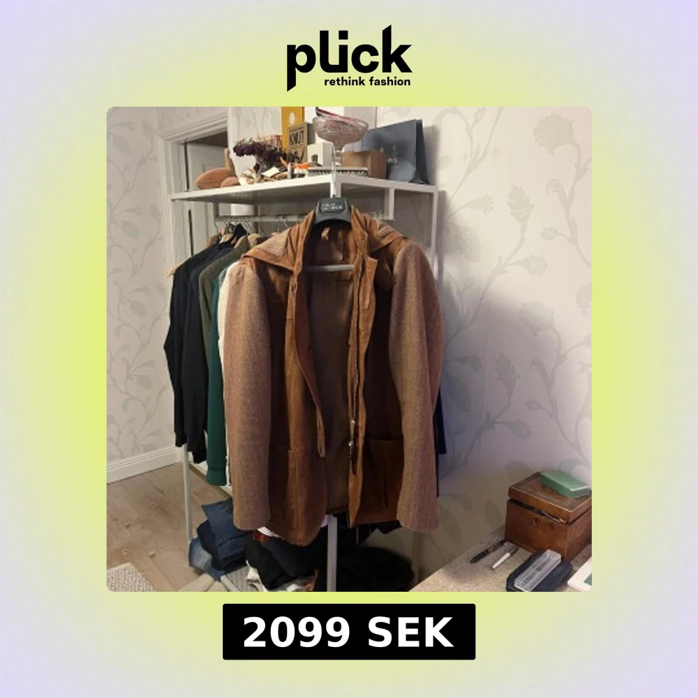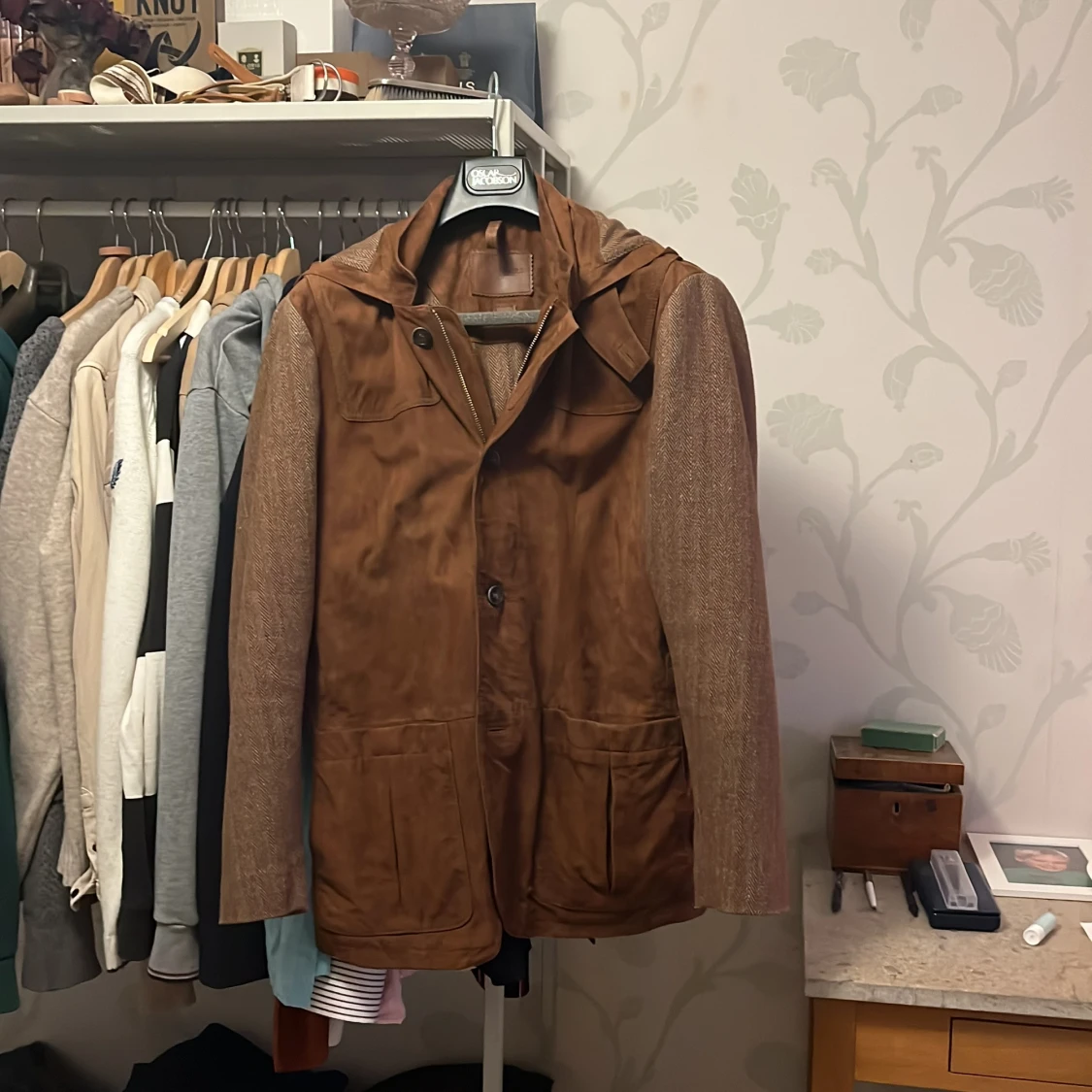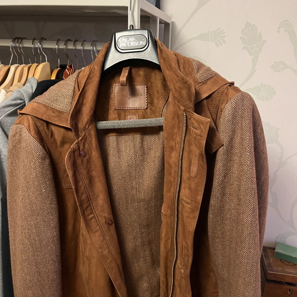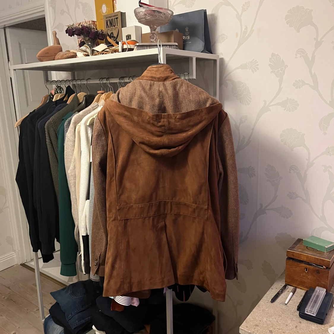Snygg brun kappa med huva. Jackan har en kombination av mocka och ett mönstrat tyg, vilket ger den en unik look. Den har knappar framtill och praktiska fickor. Perfekt för höst och vår. Den är i storlek 50 (M-L). Nypris ligger på 6999kr. Är endast använd 4 gånger!. Skriv gärna om ni har frågor🤗
