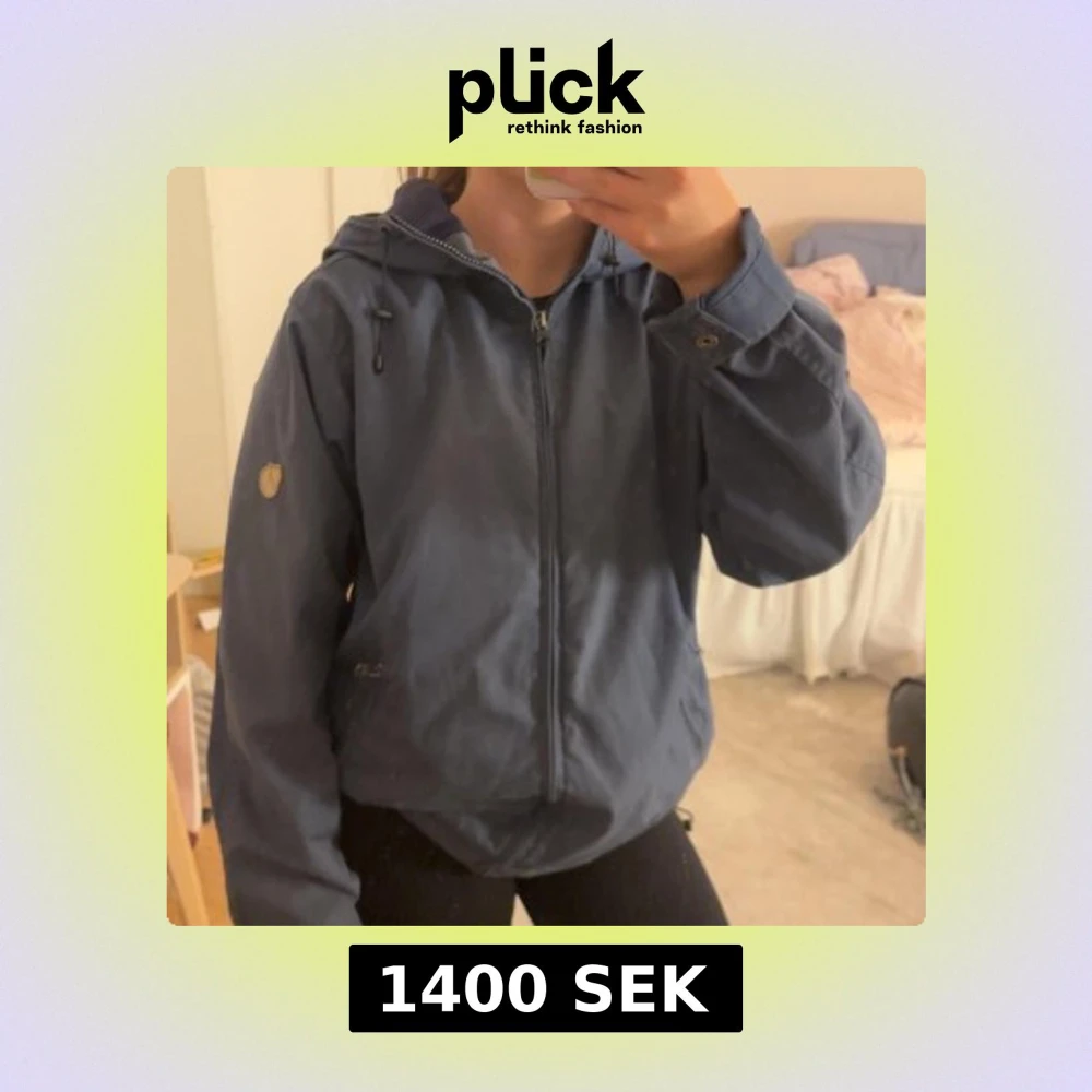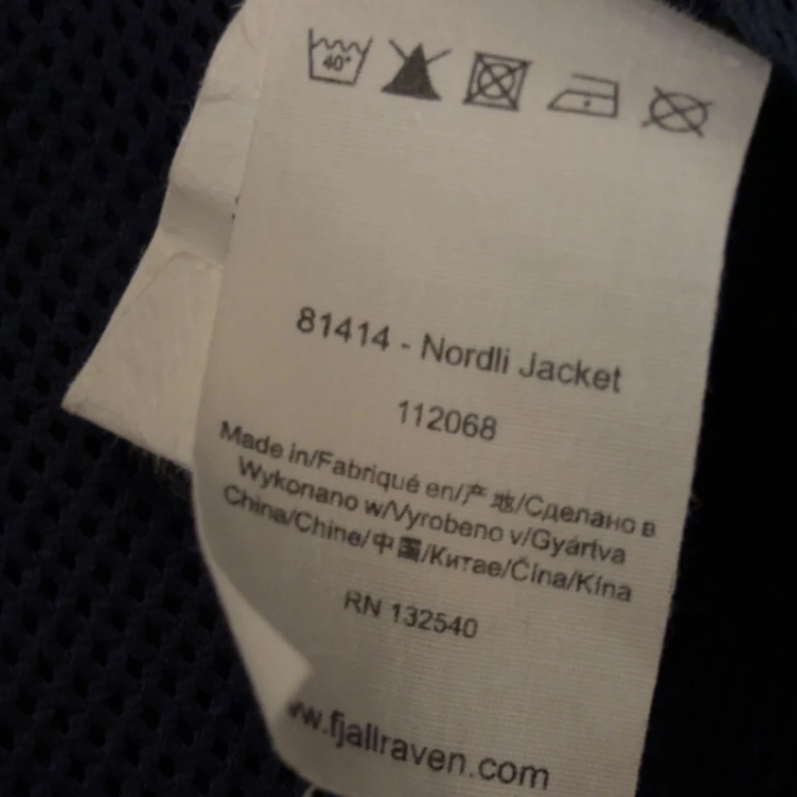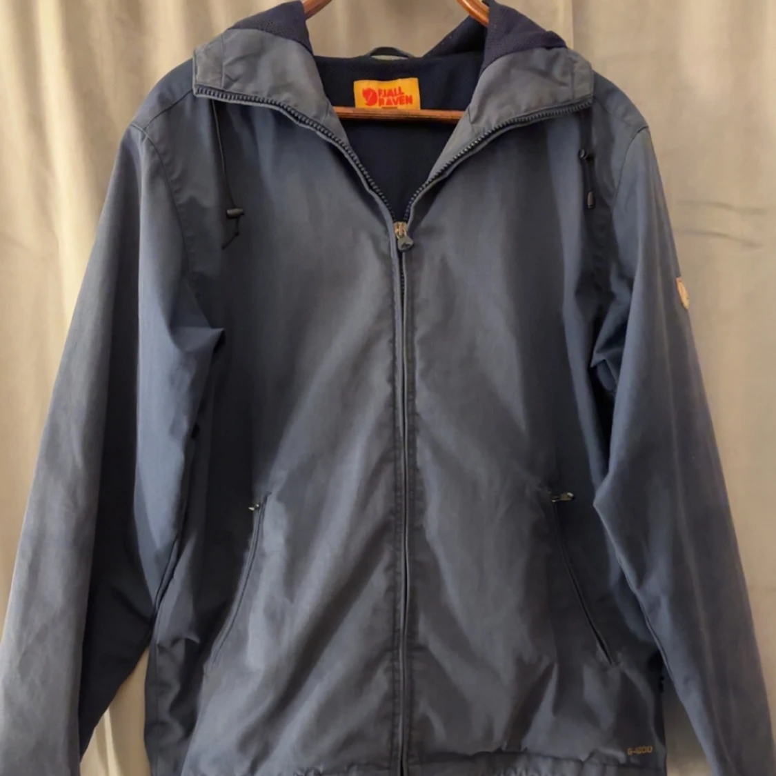 Säljer en blå vindjacka från Fjällräven, modell Nordli Jacket. Jackan har huva med snörning, dragkedja framtill och klassisk Fjällräven-logga på ärmen. Materialet är slitstark bomull och polyesterm. Storlek S