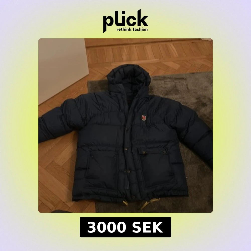 Säljer en mörkblå dunjacka från Fjällräven med huva och stora fickor framtill. Jackan har gul snörning nedtill, dragkedja och knappar. Yttertyg och foder är i polyamid, fyllningen består av 90% dun och 10% fjäder. Perfekt för kalla dagar. Jackan är i den äldre modellen och är en av dem varmaste fjällräven jackorna man kan hitta.