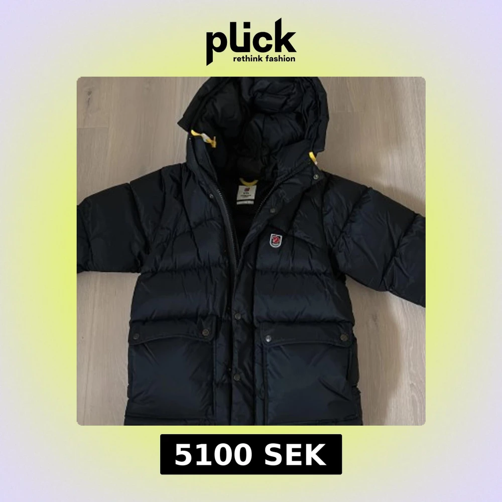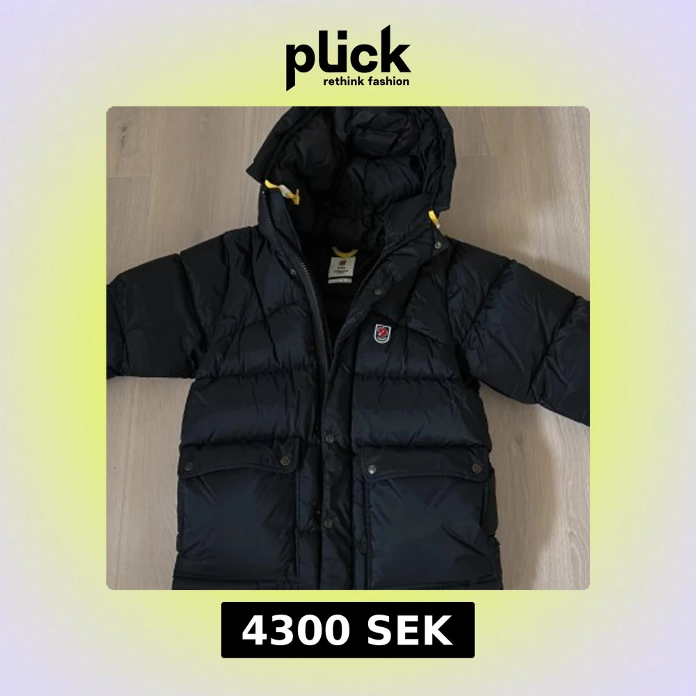 Säljer en svart dunjacka från Fjällräven Expedition Series med huva och gula detaljer. Jackan har två stora fickor framtill, dragkedja och tryckknappar. Perfekt för kalla dagar och riktigt snygg streetstil.
