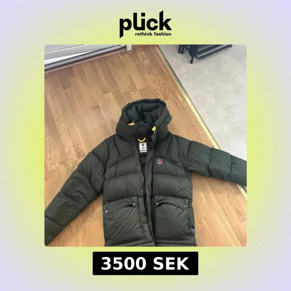 Säljer en mörkgrön Fjällräven 1974 Expedition Series dunjacka med huva och gula detaljer. Jackan är använd en halv vinter och är i nyskick, kommer med påsen som var i fickan också, kom med bud om pris inte passar er