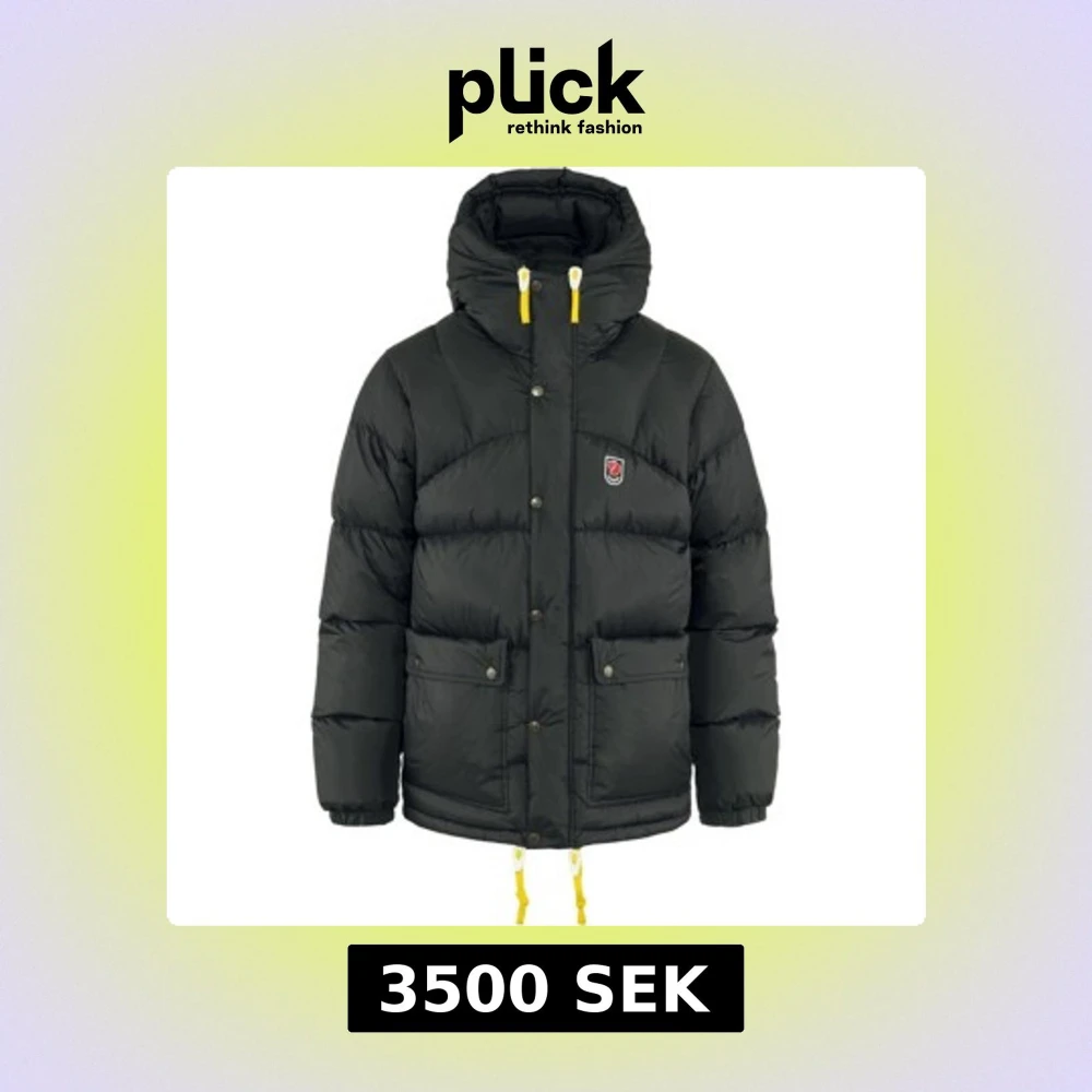 Snygg svart dunjacka från Fjällräven med huva och gula detaljer. Jackan har knappar och dragkedja framtill samt praktiska fickor. Perfekt för kalla dagar. Ett litet litet hål i höger ärm, enkelt att laga