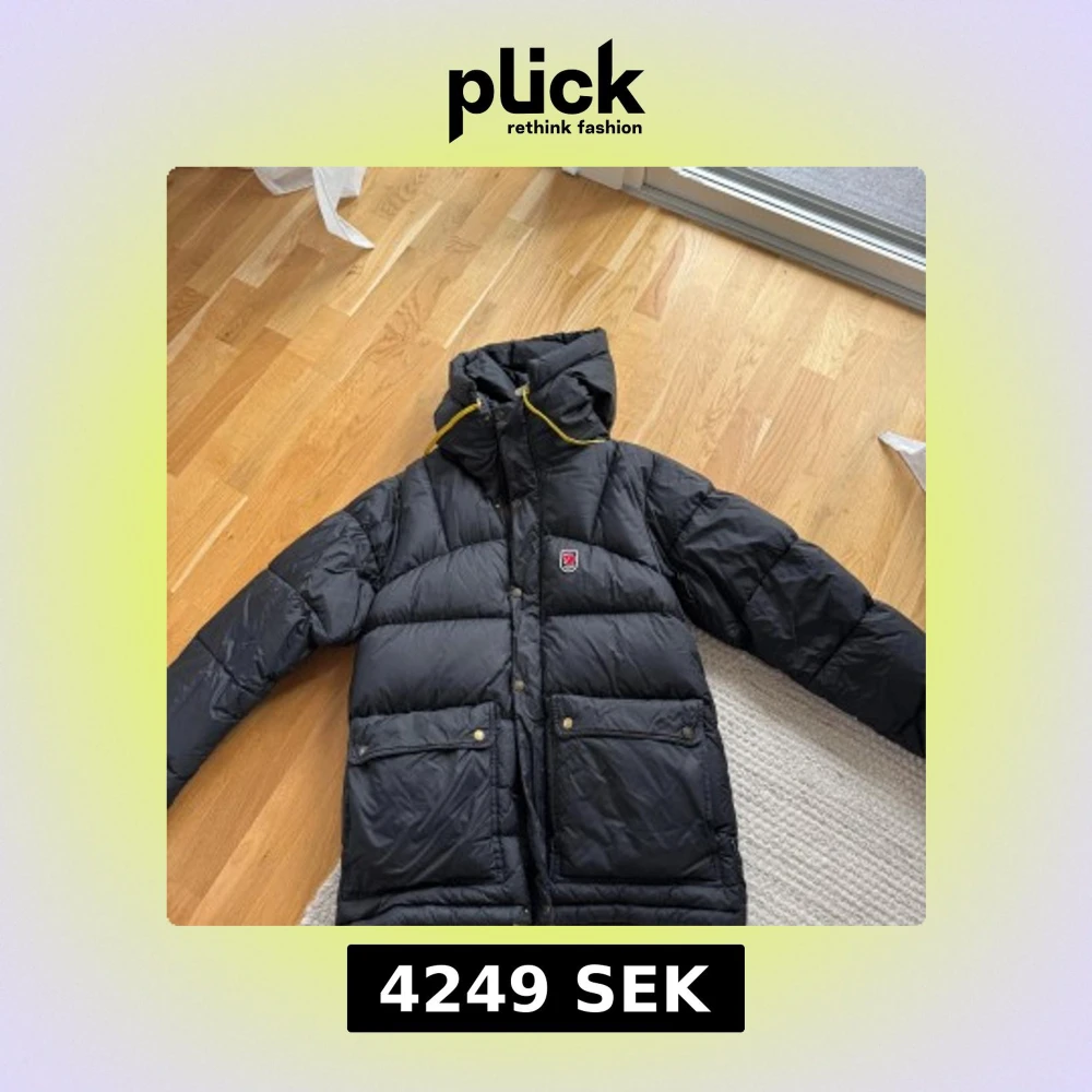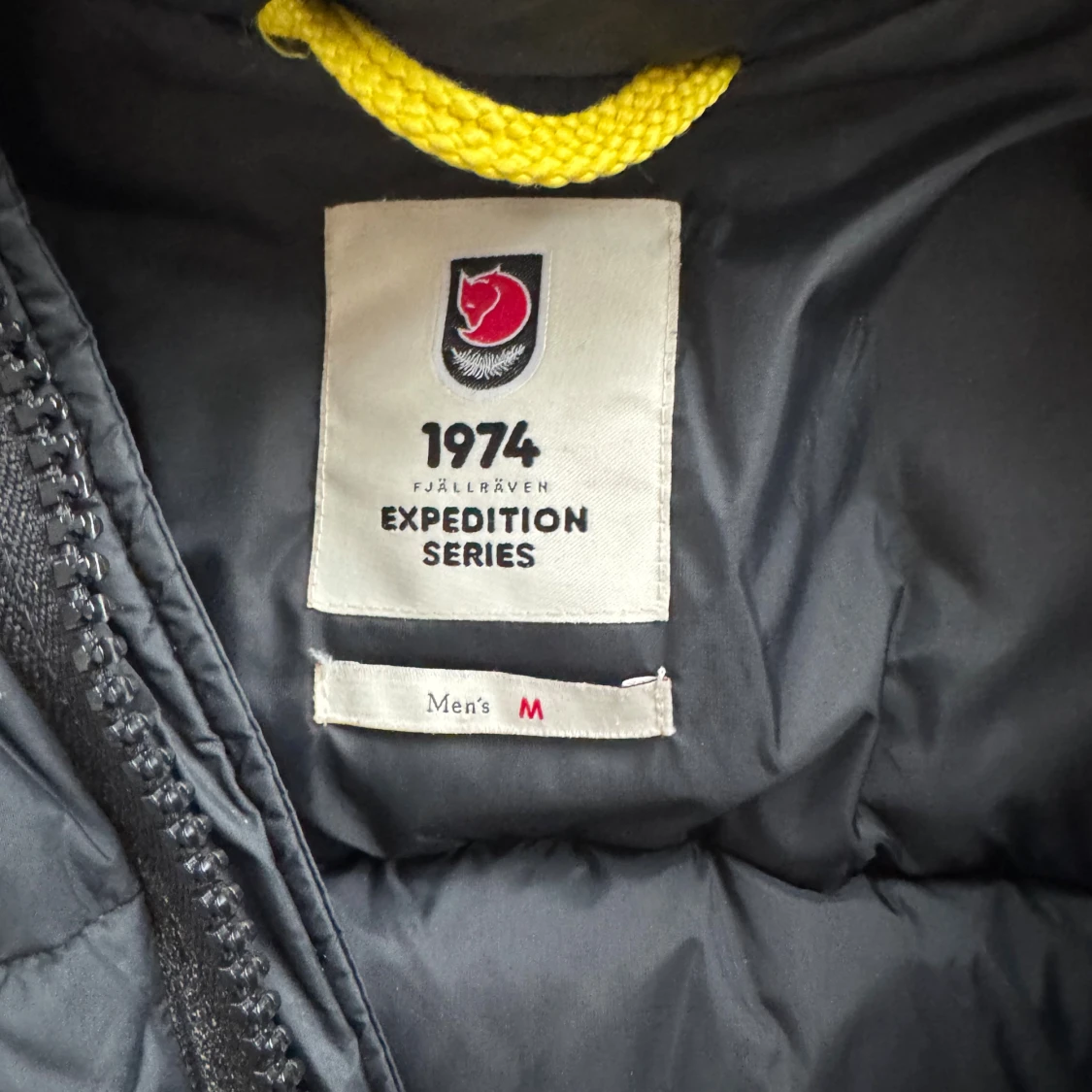 Svart Fjällräven Expedition Series dunjacka med huva och gula snören. Jackan har två stora fickor framtill med knappar och dragkedja, samt klassisk Fjällräven-logga på bröstet. Perfekt för kalla dagar och riktigt snygg streetstil.