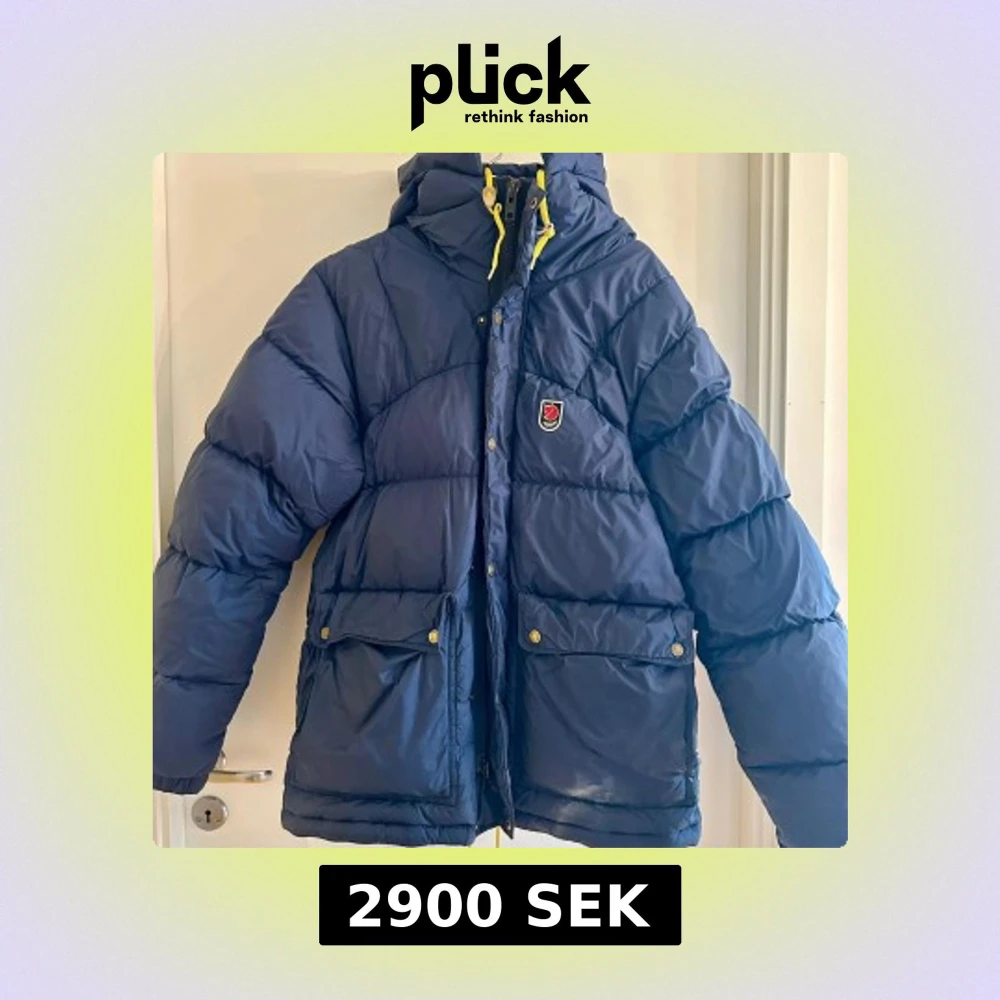 Blå pufferjacka från Fjällräven med huva, gula detaljer och två stora fickor framtill. Jackan har dragkedja och knappar, samt klassisk Fjällräven-logga på bröstet. Perfekt för kalla dagar och riktigt skön att bära.