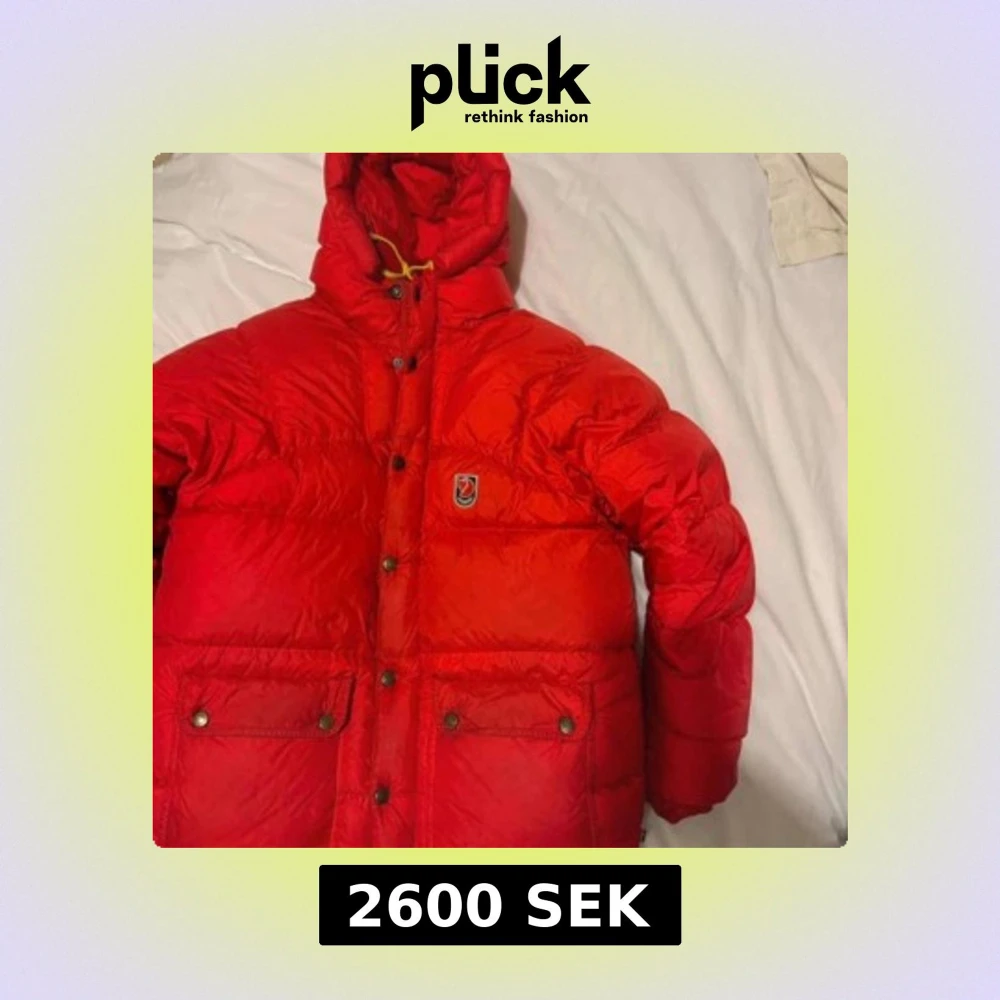 Säljer en snygg röd dunjacka från Fjällräven med huva och knappar. Jackan har en klassisk design med två stora fickor framtill och en broderad logotyp på bröstet. Perfekt för kalla dagar!