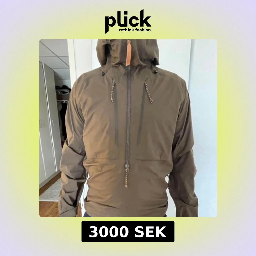 Säljer en brun vindjacka från Fjällräven med justerbar huva och dragkedjor framtill. Jackan har snygga detaljer som snörning vid huvan och klassisk Fjällräven-logga på ärmen. Perfekt för utomhusaktiviteter och stilren look.