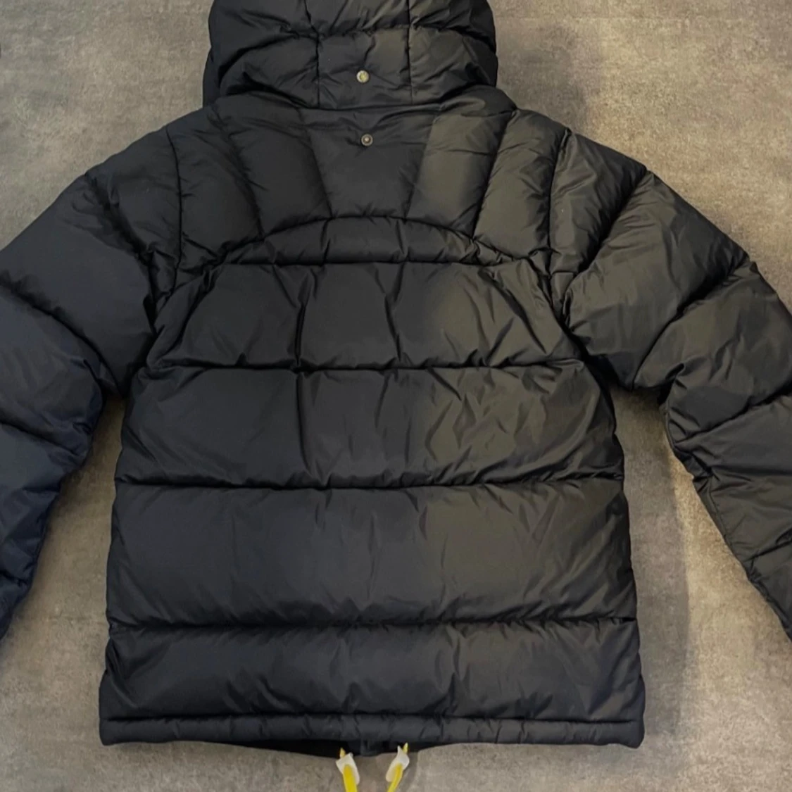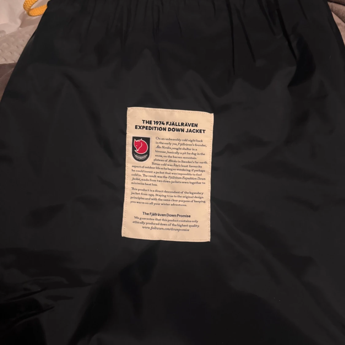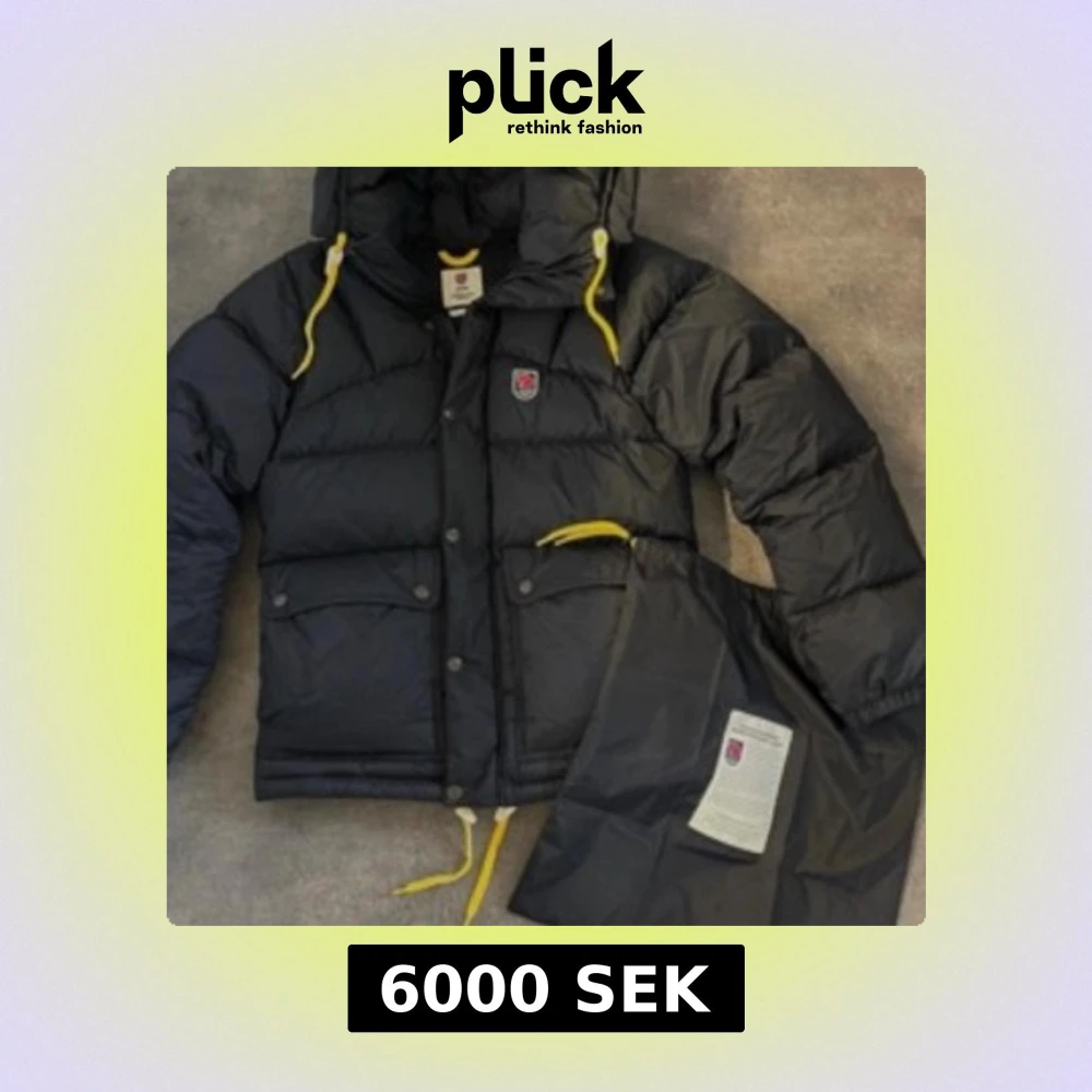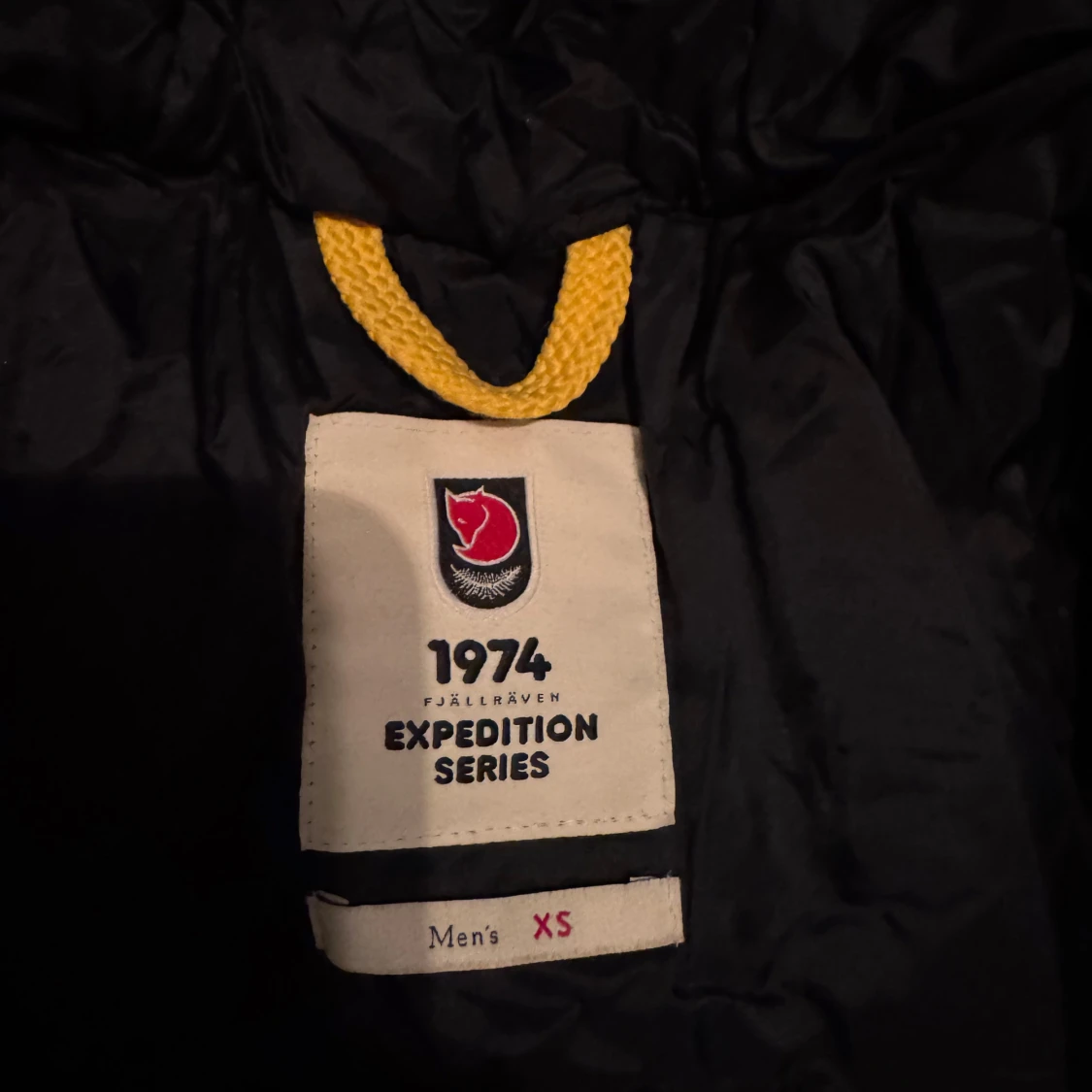 Svart Fjällräven Expedition dunjacka med gula snören och huva. Jackan har tryckknappar med logga, stora fickor framtill och klassisk Fjällräven-märke på bröstet. Puffig och varm modell, perfekt för kalla dagar. Medföljer originalpåse med etikett. Storlek XS i herr storlek men passar mig som bär XS och S i damstorlek. Jag jämförde S i dam och XS i herr och de är snarlika. Nästintill helt oanvänd och super fint skick. Inga tecken på användning syns dvs inga fläckar, trasiga sömmar you name it.