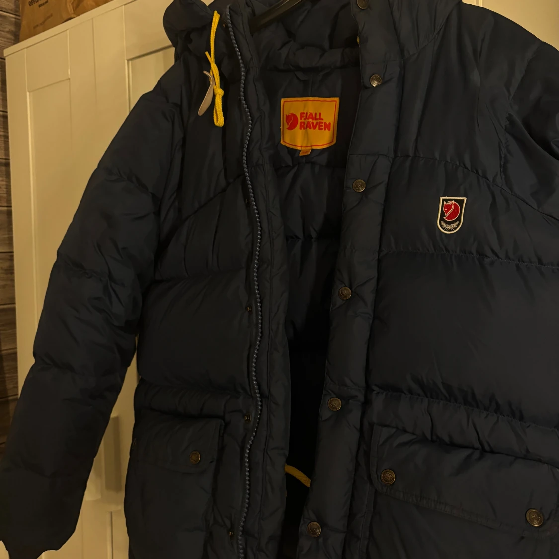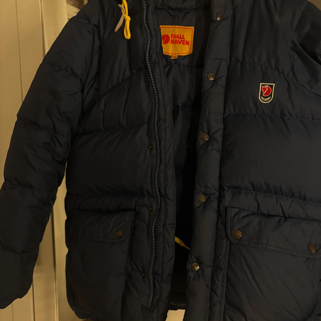 Snygg mörkblå dunjacka från Fjällräven med gul snörning vid huvan och klassisk logga på bröstet. Jackan har stora fickor med knappar, dragkedja och tryckknappar framtill. Perfekt för kalla dagar och har en cool, puffig look. Storlek XXS men passar även upp till M! Inga defekter