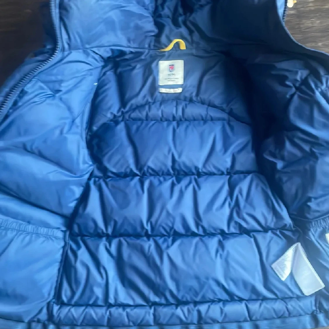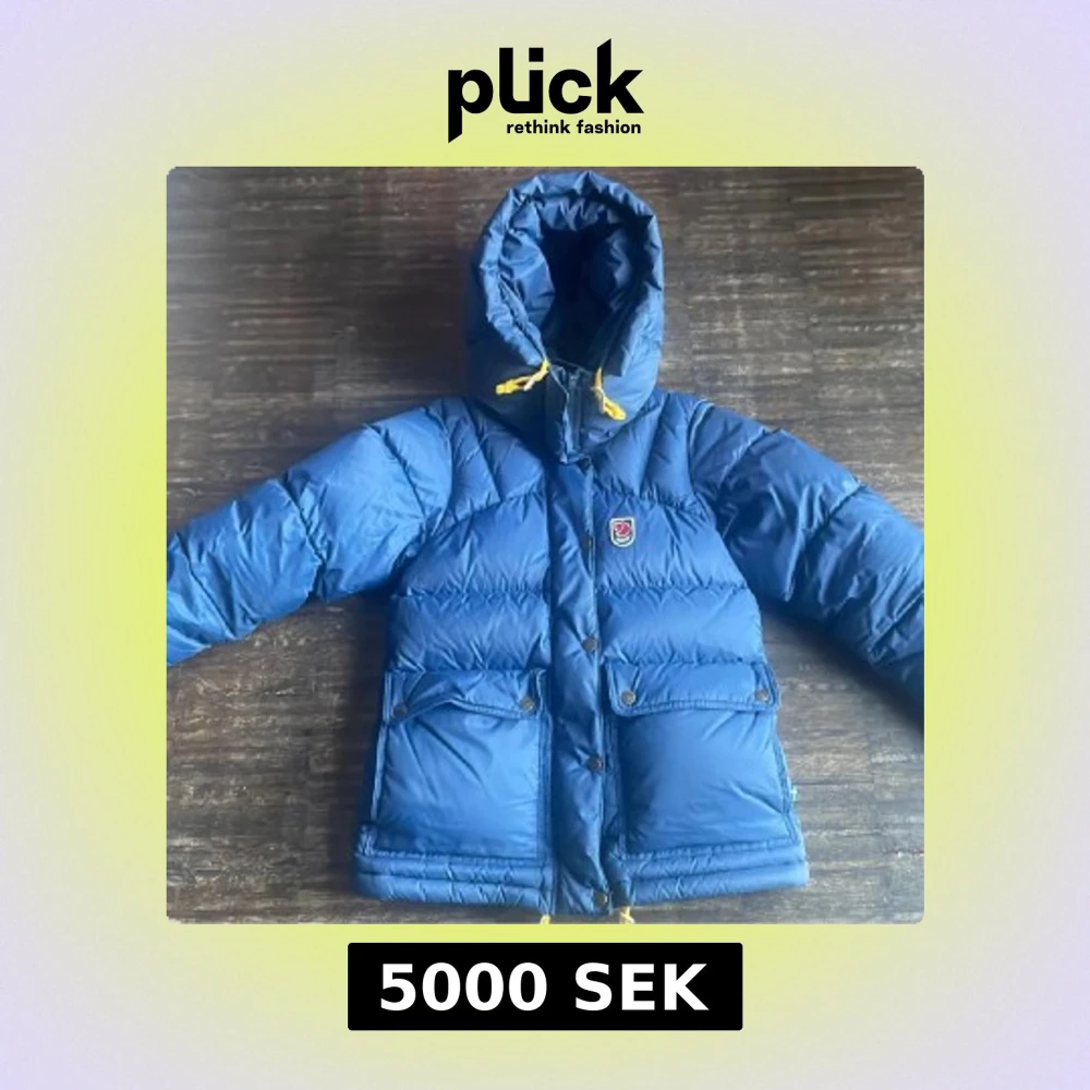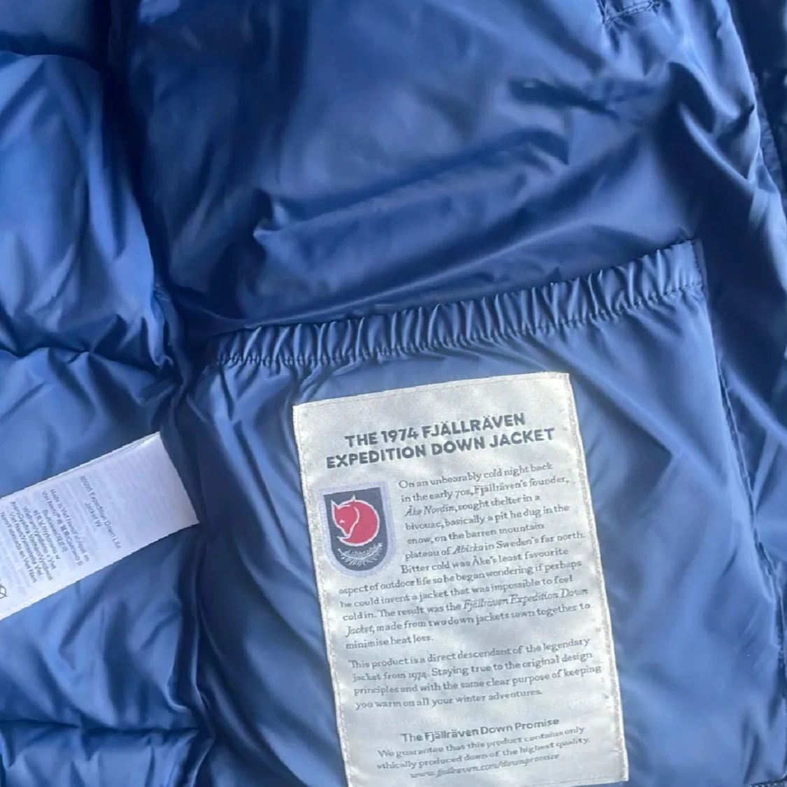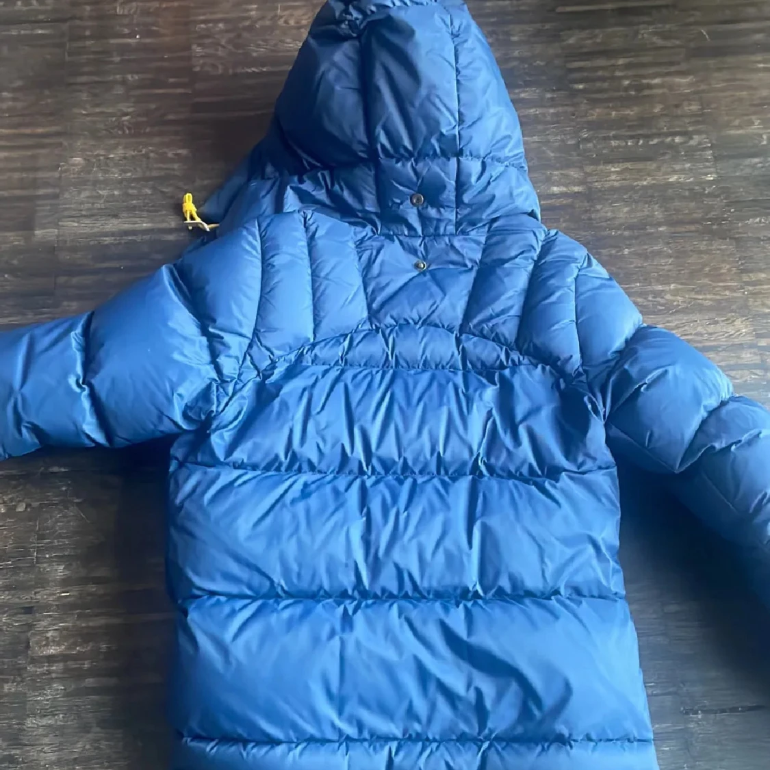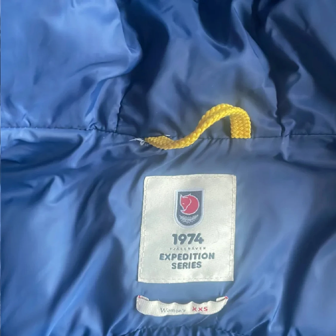 Säljer en blå Fjällräven 1974 Expedition Series dunjacka med huva och gula snören. Jackan har två stora fickor framtill, klassisk Fjällräven-logga på bröstet och är riktigt puffig. Perfekt för kalla vinterdagar och har en ikonisk outdoor-look. Använd fåtal gången