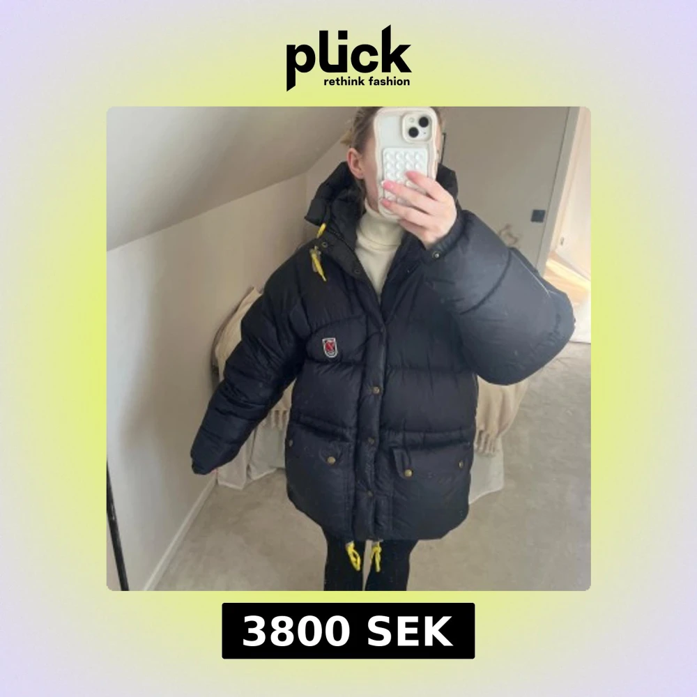 Assnygg svart fjällrävenjacka i storlek XXS. Den är puffig men inte ”större” i storlek. Ett litet litet hål på armen (se bild 3), dock inget man tänker på. Och ett ”riv hål” nere på armen men inte alls så märkbart (se bild 4), som går att täcka lätt om man spänner åt armen. Annars fint skick! 🖤