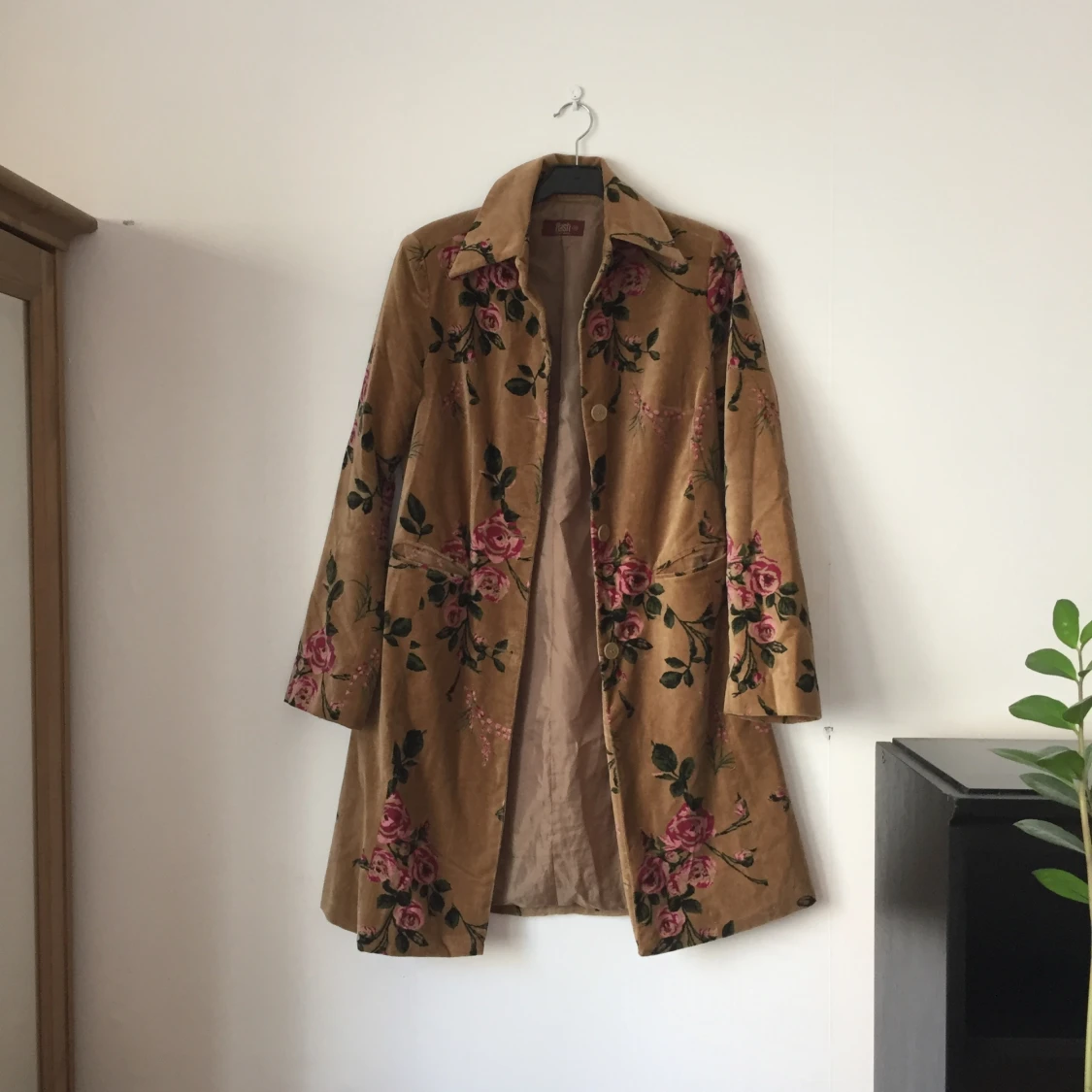 Mycket vacker kappa, sanmetsaktigt mjukt material. Gyllenbrun med rosor. Södermalm, rock, musiker-boho chic -feeling. Den är lite sliten vid ena fickan (något jag inte sett förut). Syns på en av bilderna och bara om man tittar nära.