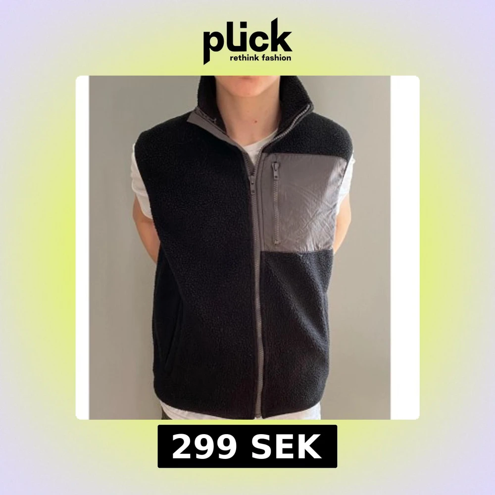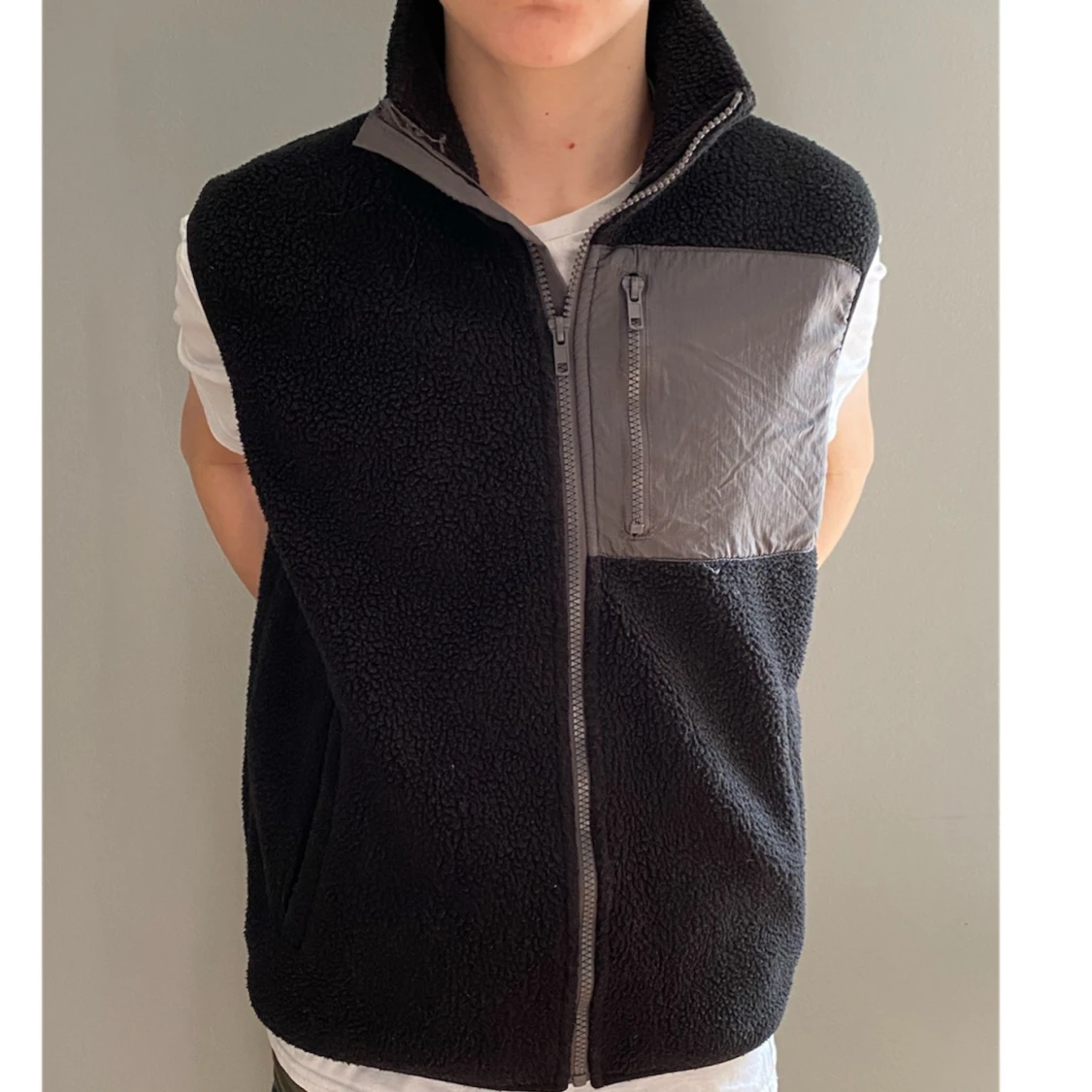 Snygg svart fleeceväst med grå detaljer och dragkedja framtill. Perfekt för lager-på-lager under kyliga dagar. Västen har en praktisk bröstficka med dragkedja för säker förvaring. Storlek: S