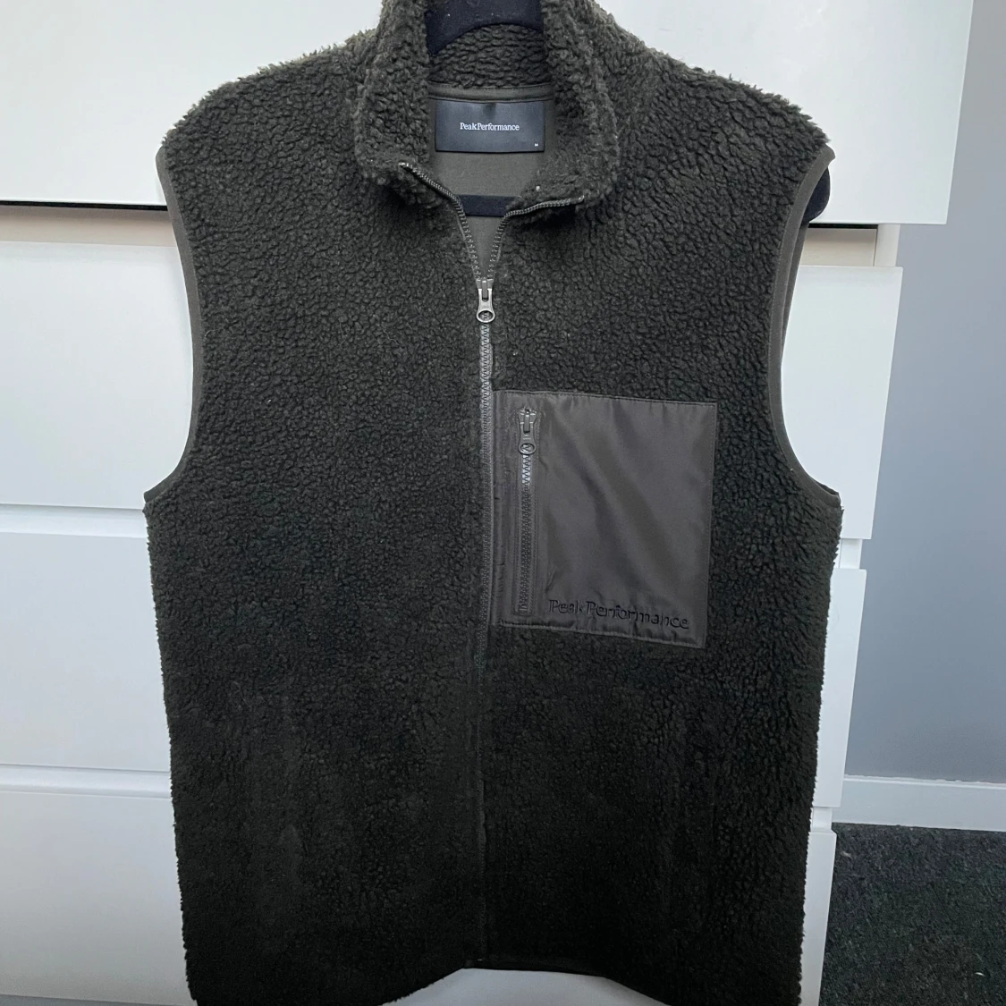 Det är en mörkgrön fleece väst från peak performance. Väldigt bra skick, inga defekter eller liknande. Storlek M men passar även S. Hör av er vid frågor 😁