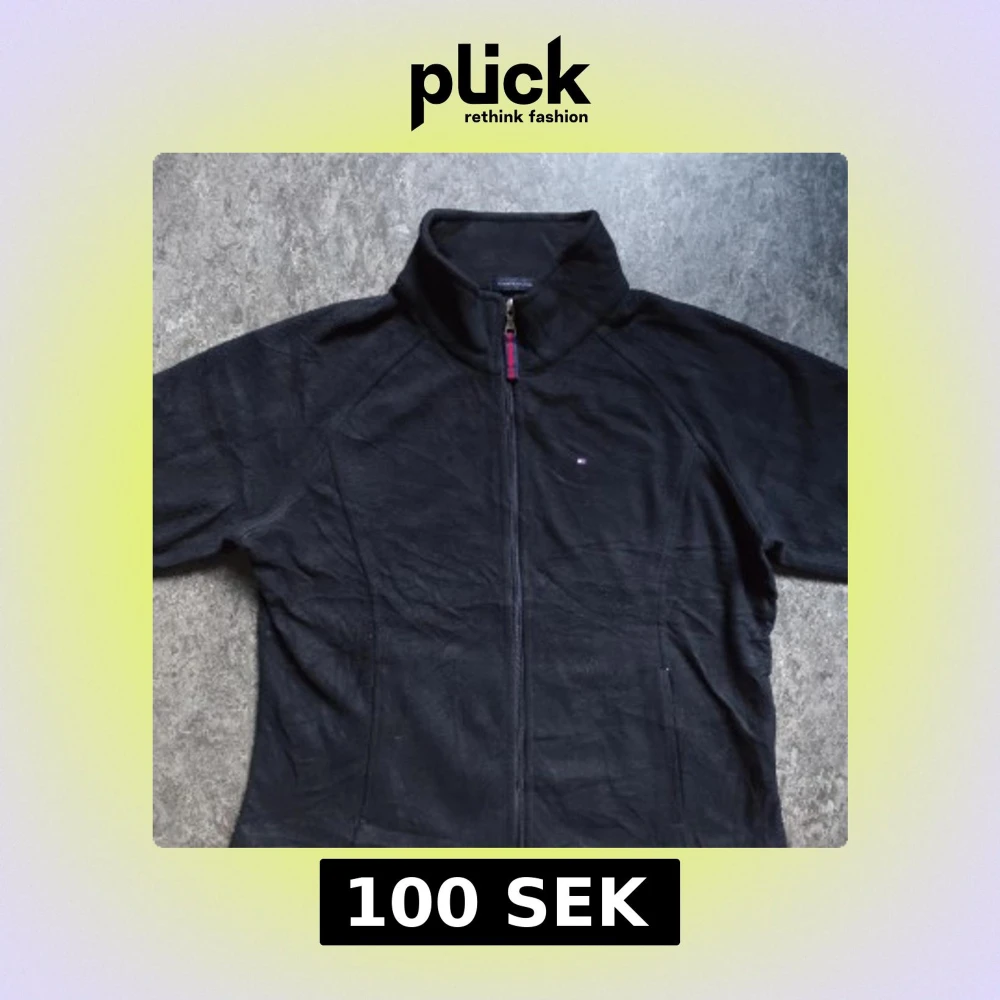 Svart fleecejacka från Tommy Hilfiger med hel dragkedja och hög krage. Jackan har diskret logga på bröstet och snygga detaljer i rött och blått vid dragkedjan. Perfekt för kyliga dagar och enkel att matcha med allt. OBS det finns små fläckar i insidan som inte syns i utsidan men ändå något man får informera om